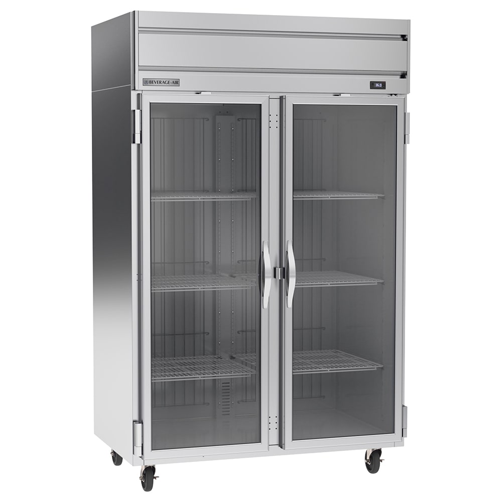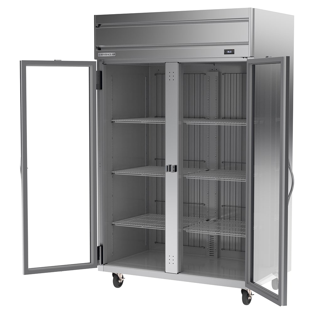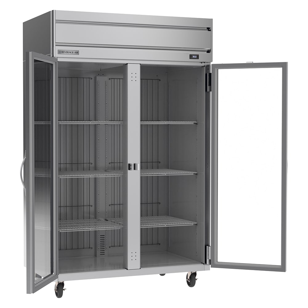 The Beverage Air HRP2HC-1G two-section reach-in refrigerator has six shelves with a wire design that encourages air to flow evenly around items. Because these shelves are epoxy coated, they resist corrosion to support heavy use. While the cabinet has an aluminum liner, the exterior is made of durable stainless steel. The interior is accessible through two glass doors, and the glass construction provides visibility from the outside.