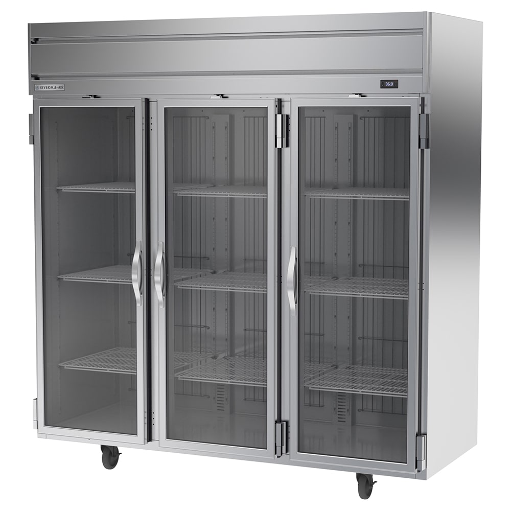 The Beverage Air HRP3HC-1G Horizon Series reach-in refrigerator has three sections for storing fresh produce, meat, and cheese. Because it has glass doors, users can see inside the cabinet to locate a product or take inventory without opening it. To increase product visibility, the cabinet is lit with LED fixtures.