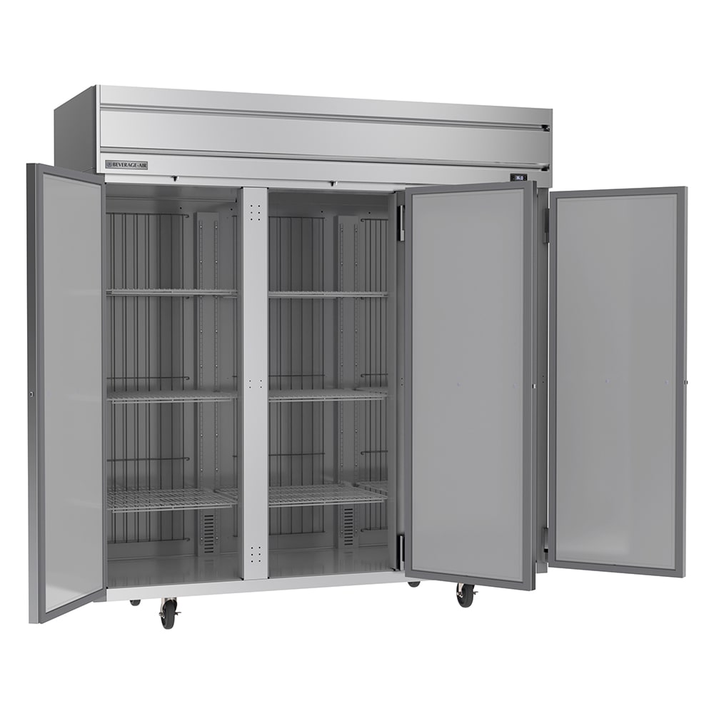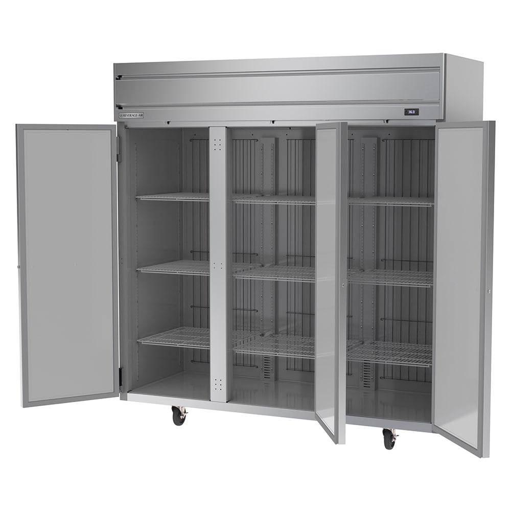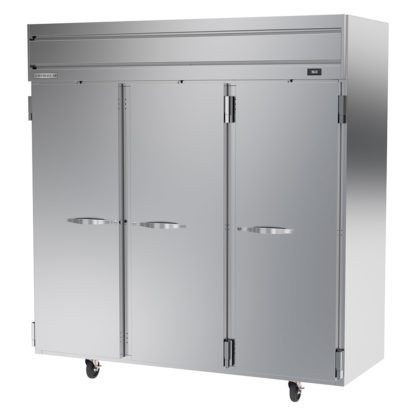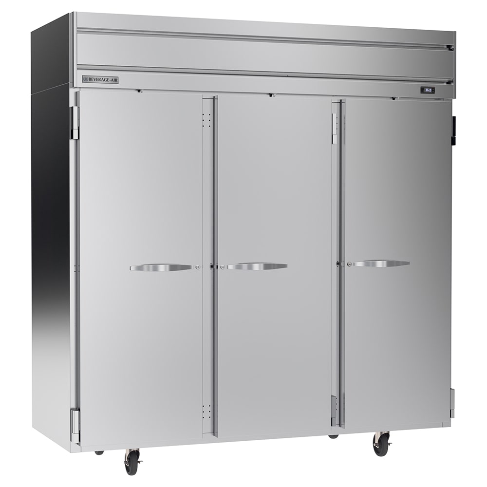 To survive frequent use in a busy environment, the Beverage Air HRP3HC-1S Horizon Series refrigerator is constructed of stainless steel and aluminum. The cabinet is mounted on 6-inch casters, so it can be relocated when it needs cleaning and maintenance. This reach-in unit has three sections, each guarded by a solid door that can be locked.