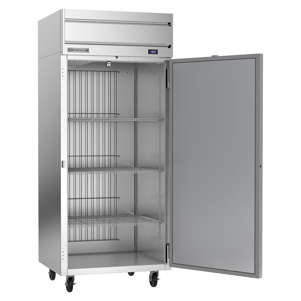 The Beverage Air HRPS1WHC-1S reach-in refrigerator has a single, wide section. To enhance product visibility, the interior is lit with LED fixtures. This unit includes three epoxy-coated shelves that are made of wire to promote airflow, organizing products while maximizing their exposure to cold air.