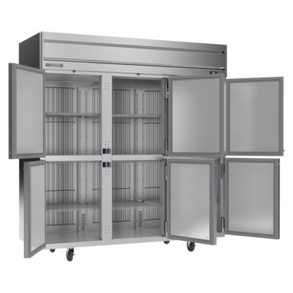 The Beverage Air HRPS3HC-1HS reach-in refrigerator is made of durable and long-lasting stainless steel. To offer protection against corrosion, the shelves and evaporator coil are coated in a protective epoxy. Its nine shelves can be adjusted to store a variety of food items, and they are made of wire so air flows evenly around product. Preventing theft and vandalism, all six of the half doors have locks, and they seal shut with magnetic gaskets to reduce energy loss.