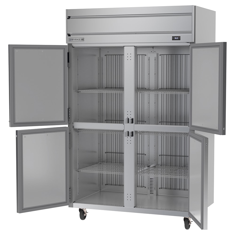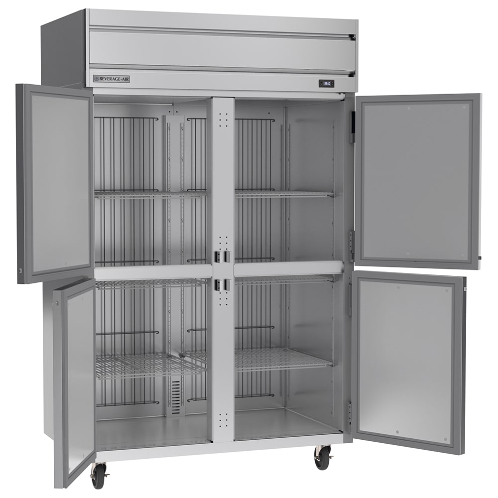 The two sections of the Beverage Air HRS2HC-1HS reach-in refrigerator have 45.2 cubic feet of interior space to store product. Its shelves are made of wire to ensure air flows evenly around all product, providing uniform cooling throughout. All six shelves are adjustable as needed, and they are coated in epoxy so they won’t corrode. This unit has four doors, and each of them contains locks to prevent theft and tampering at the end of a shift.