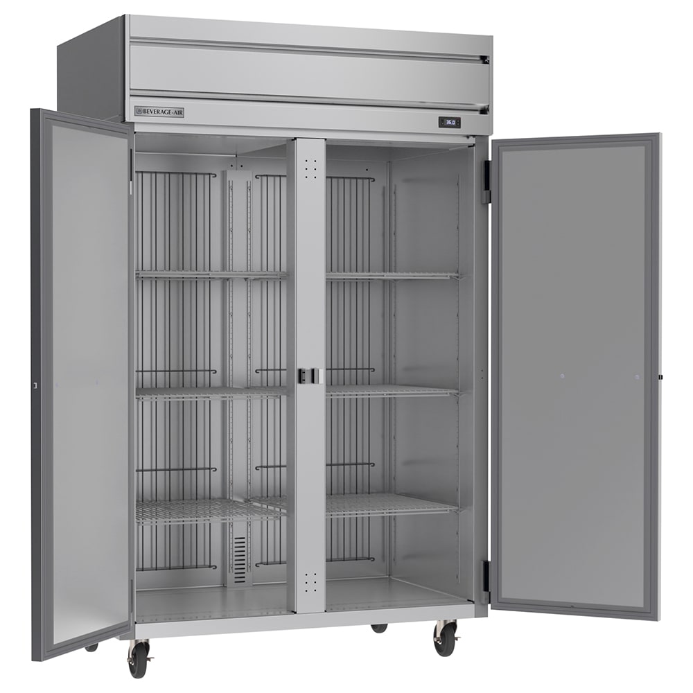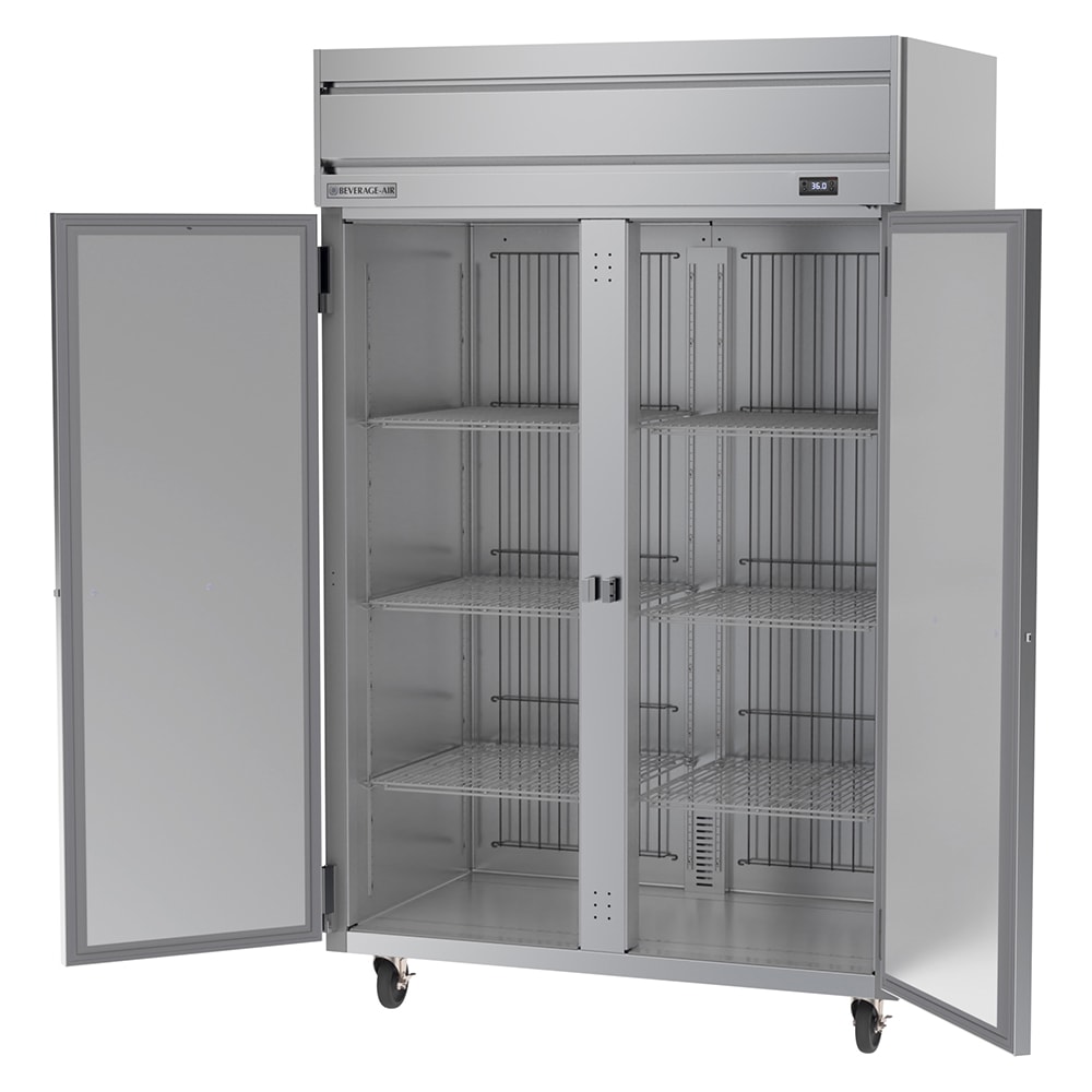 The Beverage Air HRS2HC-1S two-section refrigerator has locks on both doors to prevent theft and vandalism after hours. These doors self-close so energy doesn’t escape, and they can be propped open while employees stock product on the six shelves. Because the shelves are made of wire, air flows through the cracks to provide uniform cooling. This unit uses R290 hydrocarbon refrigerant to maintain temperatures of 36 to 38 degrees Fahrenheit, which can be adjusted and monitored with electronic controls and a digital display.