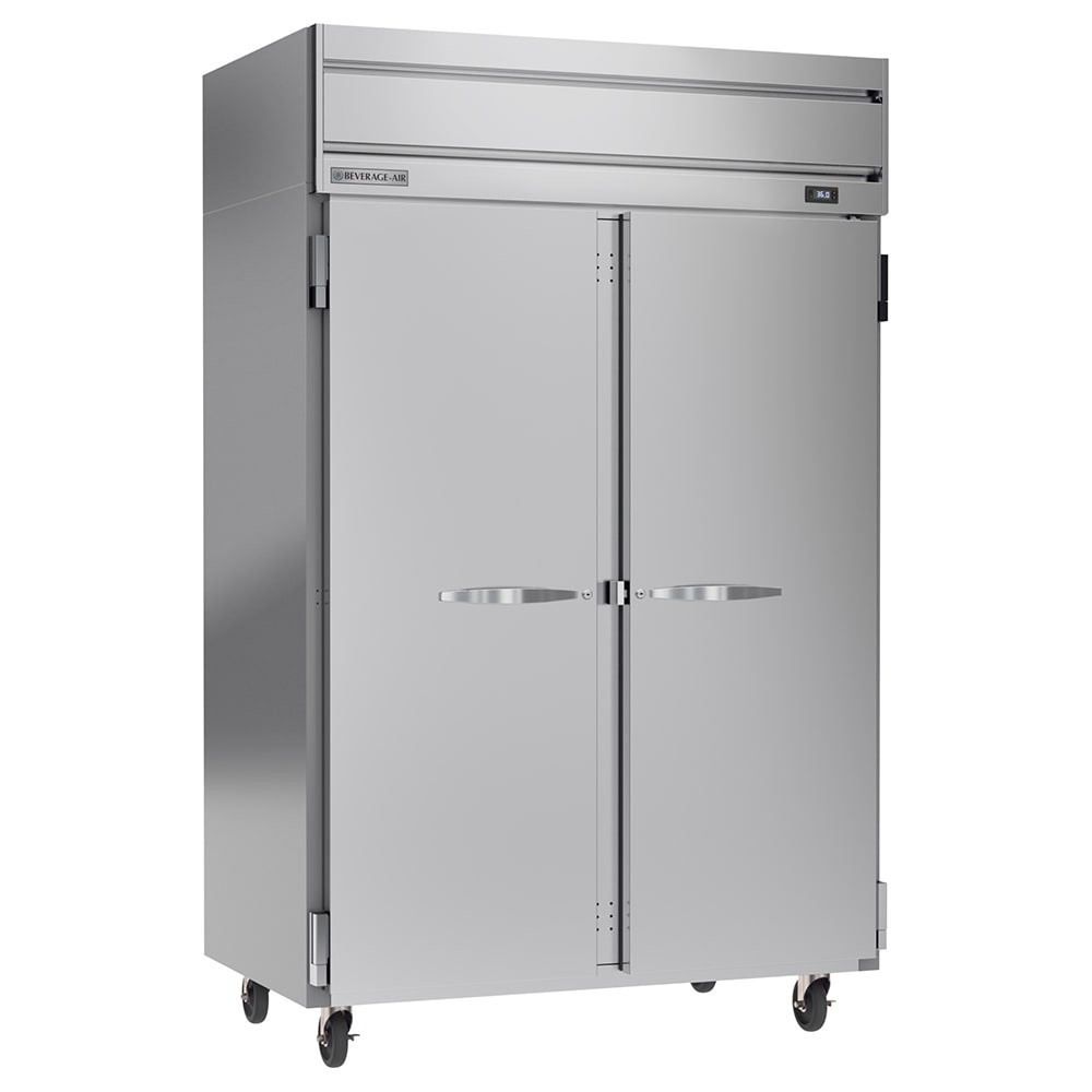 Positioned on 6-inch casters, the Beverage Air HRS2HC-1S reach-in refrigerator can be pulled out when an employee needs to sweep under it or relocate it elsewhere in the kitchen. Two of the casters include brakes to provide stability so the unit doesn’t roll during use. Made of stainless steel, this refrigerator is resistant to corrosion, denting, and scratching, extending its life in a high-volume environment.