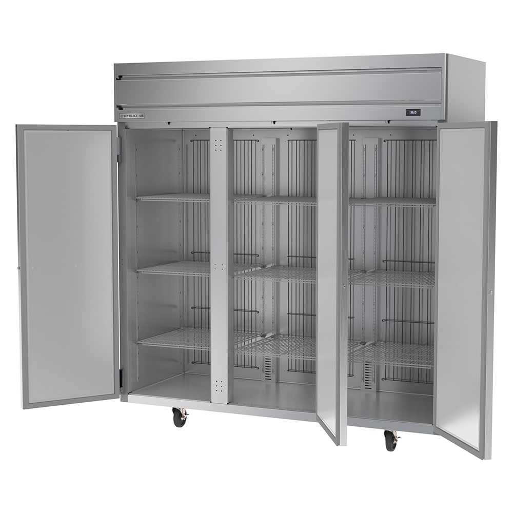 The Beverage Air HRS3HC-1S three-section refrigerator uses R290 hydrocarbon refrigerant and variable-speed technology to cool its cabinet. It operates with a self-contained refrigeration system, streamlining installation and preventing cross contamination. Because the condenser is mounted at the top of the unit, it won’t collect dust from the floor. Operators can utilize the electronic controls to change the temperature from 36 to 38 degrees Fahrenheit, and a digital display provides a readout of this number.