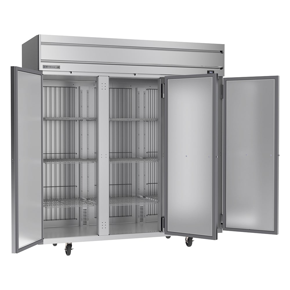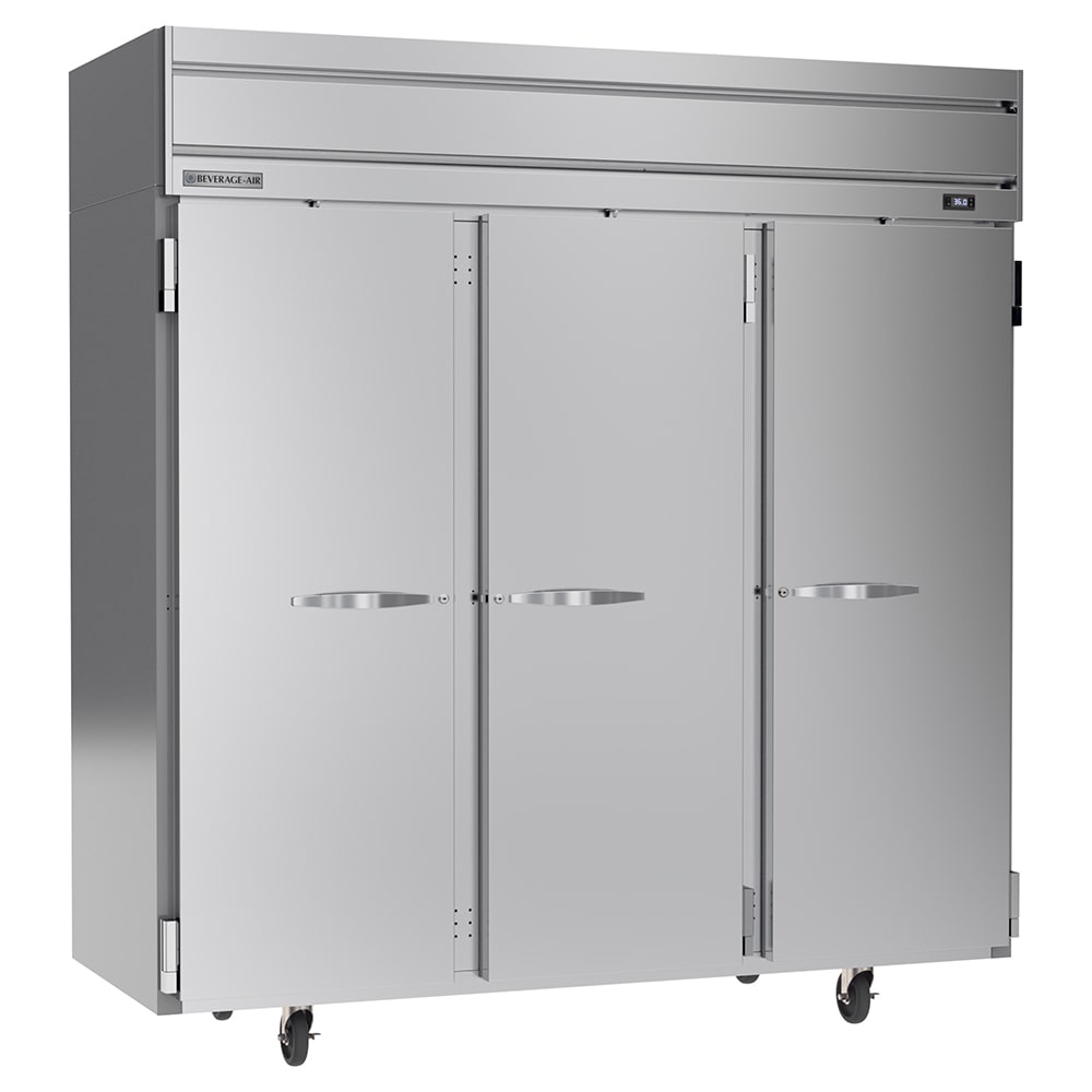 Horizon Series Refrigerator, reach-in, three-section, 71.52 cu. ft., (1) center solid door right-hand hinged, (1) right solid door right-hand hinged, (1) left solid door left-hand hinged, door locks, (9) shelves, electronic control, LED interior lighting, digital display, stainless steel front, gray painted sides, stainless steel interior, top-mounted self-contained refrigeration, Variable Speed Technology, cULus, UL EPH Classified, UL-Sanitation, Made in USA