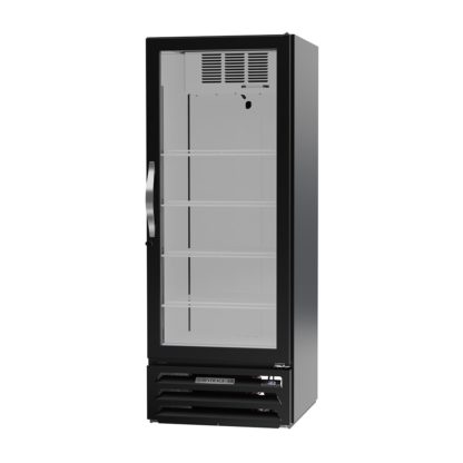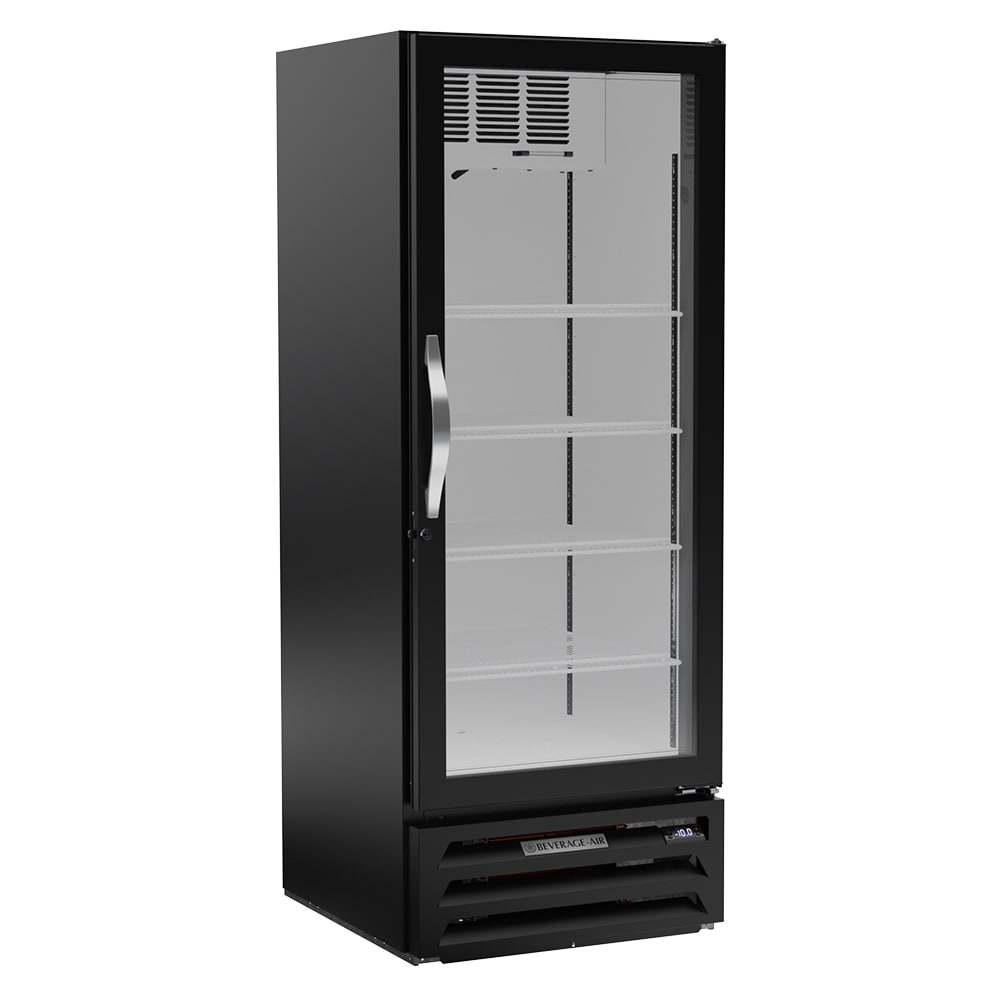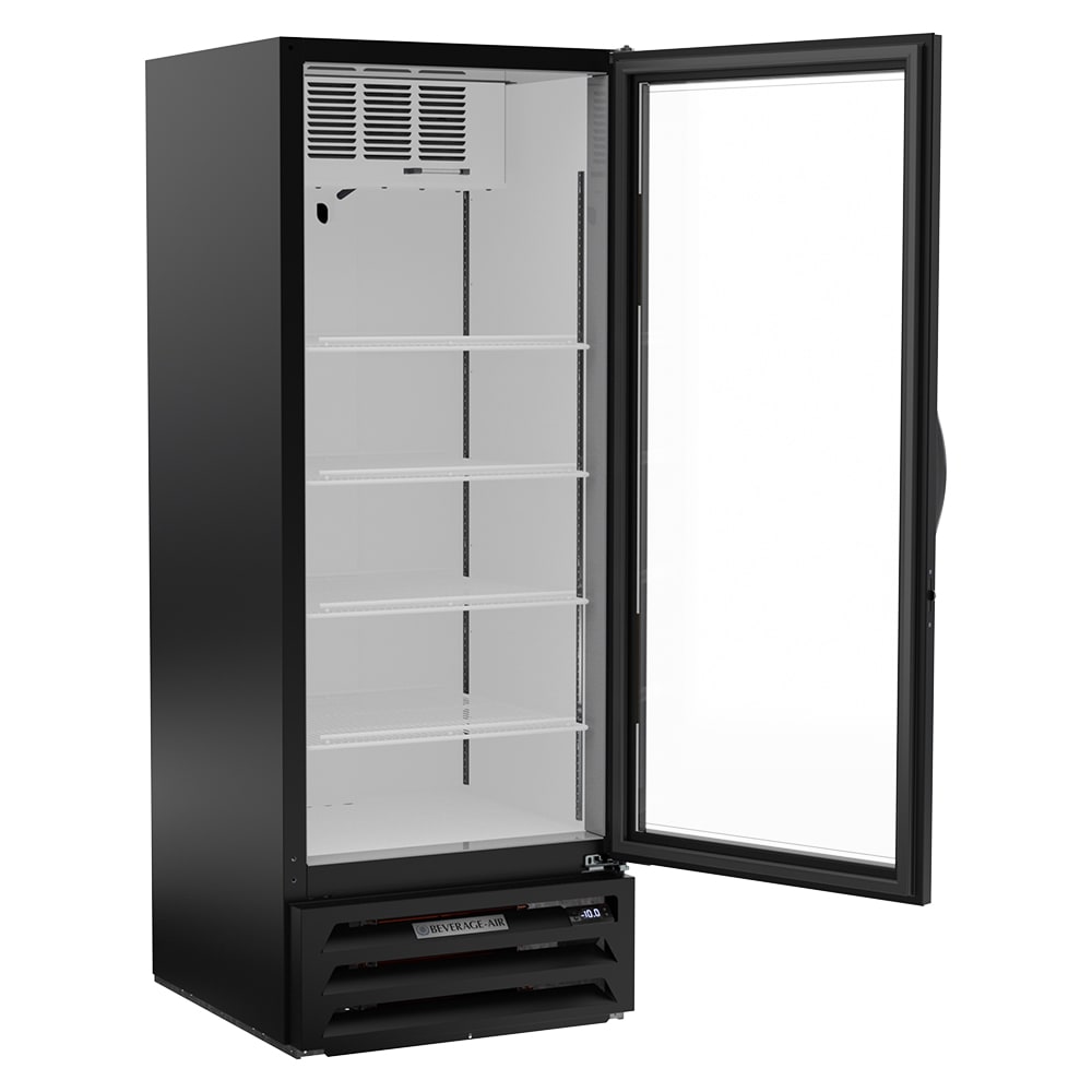 The Beverage Air MMF12HC-1-B MarketMax display freezer features one section with four shelves, each protected with corrosion-resistant epoxy. Its triple-paned glass door self-closes with a 120-degree stay-open feature, enabling operators to load the unit without obstruction.