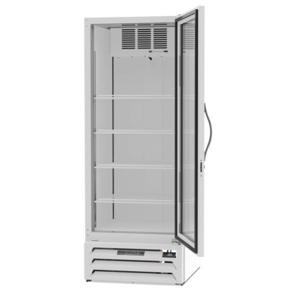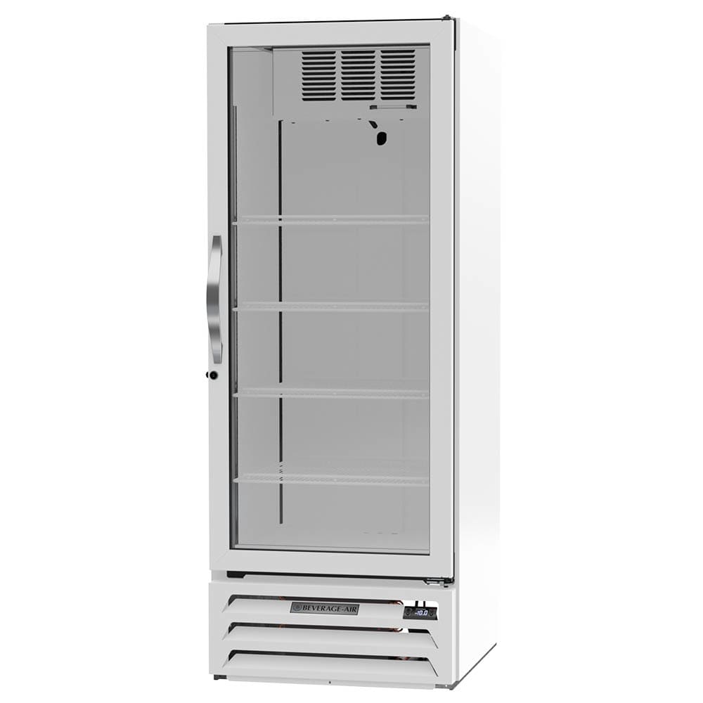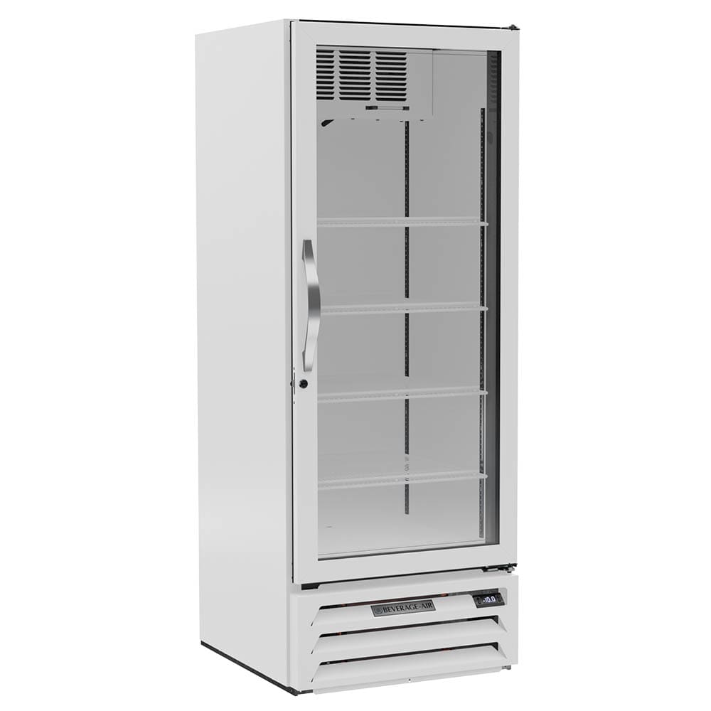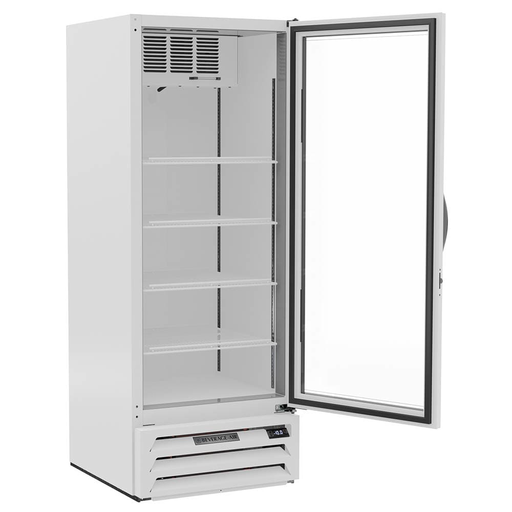 The Beverage Air MMF12HC-1-W MarketMax one-section freezer features one triple-paned, self-closing glass door. To offer clear product visibility, the interior is fitted with LED lighting.