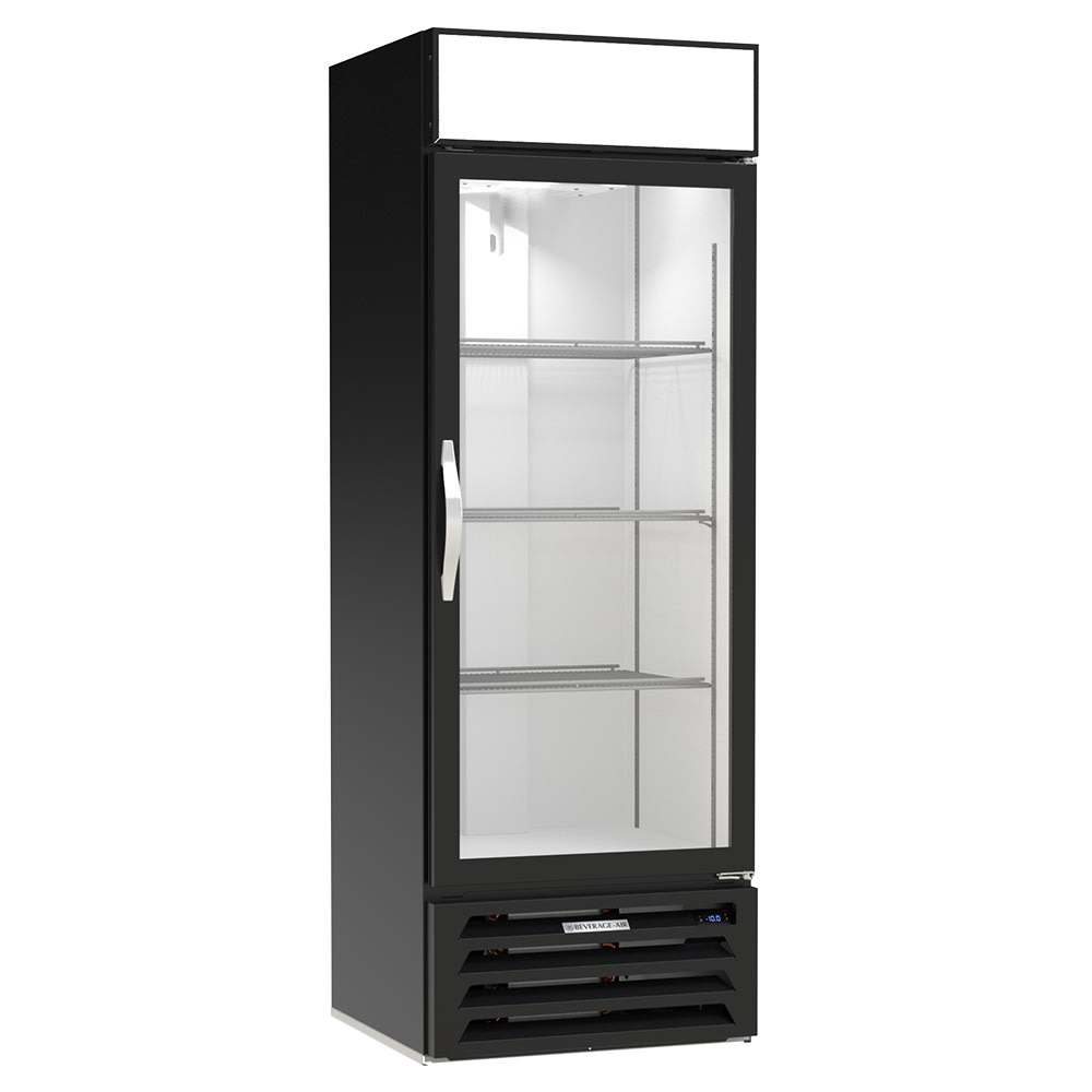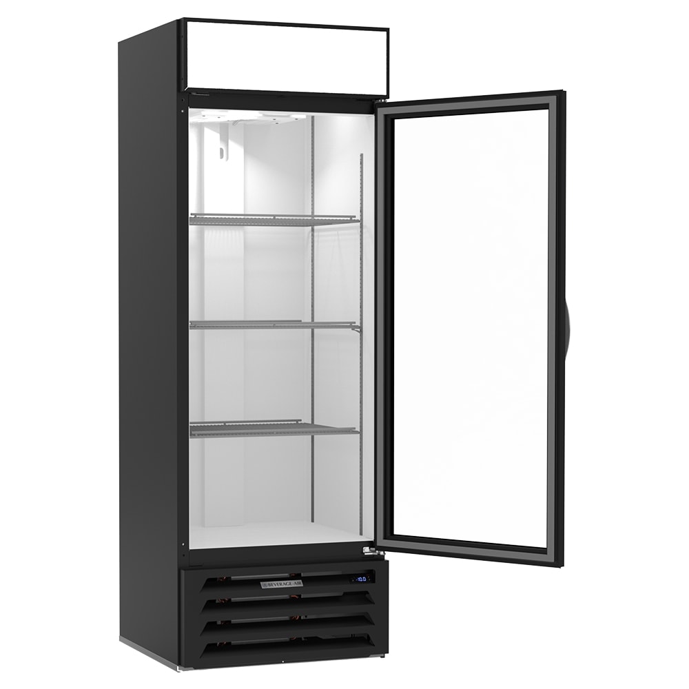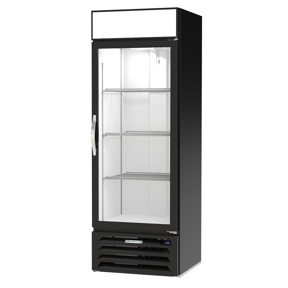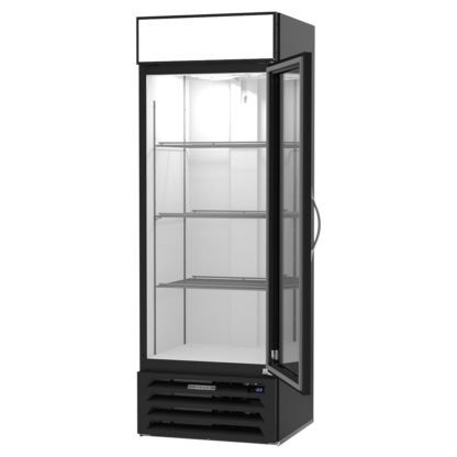 MarketMax Freezer Merchandiser, reach-in, one-section, 27-1/4″W, 78-1/8″H, (1) triple pane hinged glass door, 17.87 cu. ft. capacity, electronic control, digital display, (3) epoxy coated steel shelves, LED interior lighting, lighted sign panel, self closing door with automatic hold-open feature, bottom-mounted refrigeration, white interior, black exterior, R290 Hydrocarbon refrigerant, 3/4 HP, cULus, UL EPH Classified, UL-Sanitation, Made in USA