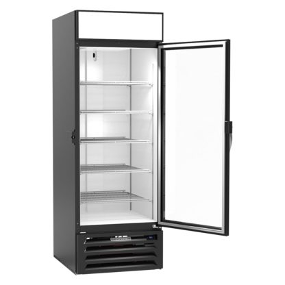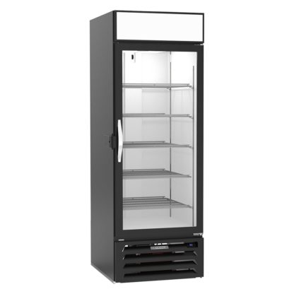 MarketMax Freezer Merchandiser, reach-in, one-section, (1) double pane hinged glass door with electronic lock, 22.5 cu. ft. capacity, electronic control, digital display, (5) epoxy coated wire shelves, LED interior lighting, lighted sign panel, self closing door with automatic hold-open feature, bottom-mounted refrigeration, black exterior, R290 Hydrocarbon refrigerant, 3/4 HP, cULus, UL EPH Classified, UL-Sanitation, Made in USA