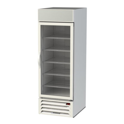 The Beverage Air MMF23HC-1-W MarketMax one-section glass door freezer merchandiser comes with five epoxy-coated shelves. Due to their wire design, these shelves have gaps that encourage air to flow around displayed products evenly. Product stored on these shelves is visible since LED lighting brightens the interior, along with the white-coated steel finish. Because the exterior is also white, it fits into most settings. A sign panel lights up to attracts guests to the unit and help increase impulse buys. The door stays open past 120 degrees.