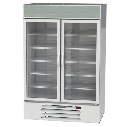 MarketMax Freezer Merchandiser, reach-in, two-section, (2) triple pane hinged glass doors, 44 cu. ft. capacity, electronic control, digital display, (10) epoxy coated steel shelves, LED interior lighting, lighted sign panel, self closing door with automatic hold-open feature, bottom-mounted refrigeration, white exterior, R290 Hydrocarbon refrigerant, 3/4 HP, cULus, UL EPH Classified, UL-Sanitation, Made in USA