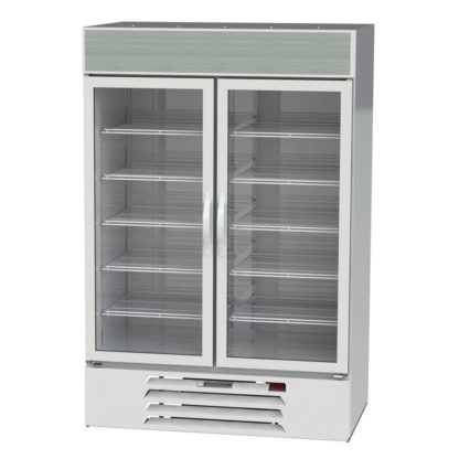 MarketMax Freezer Merchandiser, reach-in, two-section, (2) double pane hinged glass doors with electronic locks, 44 cu. ft. capacity, electronic control, digital display, (10) epoxy coated wire shelves, LED interior lighting, lighted sign panel, self closing door with automatic hold-open feature, bottom-mounted refrigeration, white exterior, R290 Hydrocarbon refrigerant, 3/4 HP, cULus, UL EPH Classified, UL-Sanitation, Made in USA
