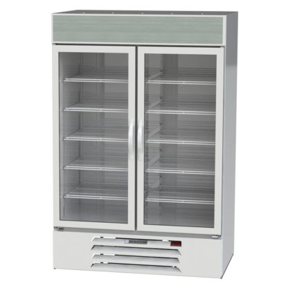 The Beverage Air MMF49HC-1-W MarketMax two-section glass door freezer merchandiser has a bottom-mounted refrigeration system, keeping the components in a cooler location than top-mounted units. Quiet and self-contained, all the system’s components are built together for quick maintenance, and since they are in the bottom, they can be conveniently accessed from behind the one-piece grille. Using R290 hydrocarbon refrigerant, the temperature stays at and below 0 degrees Fahrenheit.