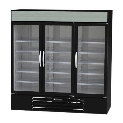 The Beverage Air MMF72HC-5-B three-section freezer is equipped with snap-in gaskets to retain cold air effectively. For visibility, its doors are constructed of tripled-paned glass and its interior is fitted with LED lights. This unit features an electric, automatic smart defrost and cools with eco-friendly R290 refrigerant.