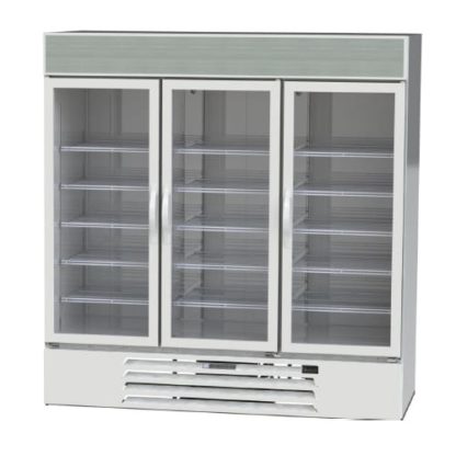 MarketMax Freezer Merchandiser, reach-in, three-section, 68.5 cu. ft. capacity, (3) triple pane hinged glass doors, electronic control, digital display, (15) epoxy coated wire shelves, LED interior lighting, lighted sign panel, self-closing door with automatic hold-open feature, bottom-mounted self-contained refrigeration, white interior walls, white exterior, R290 refrigerant, (2) 3/4 HP, cULus, UL EPH Classified, UL-Sanitation, Made in USA