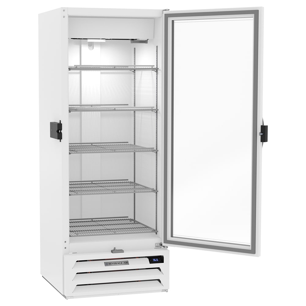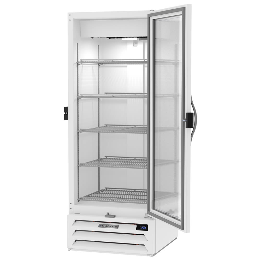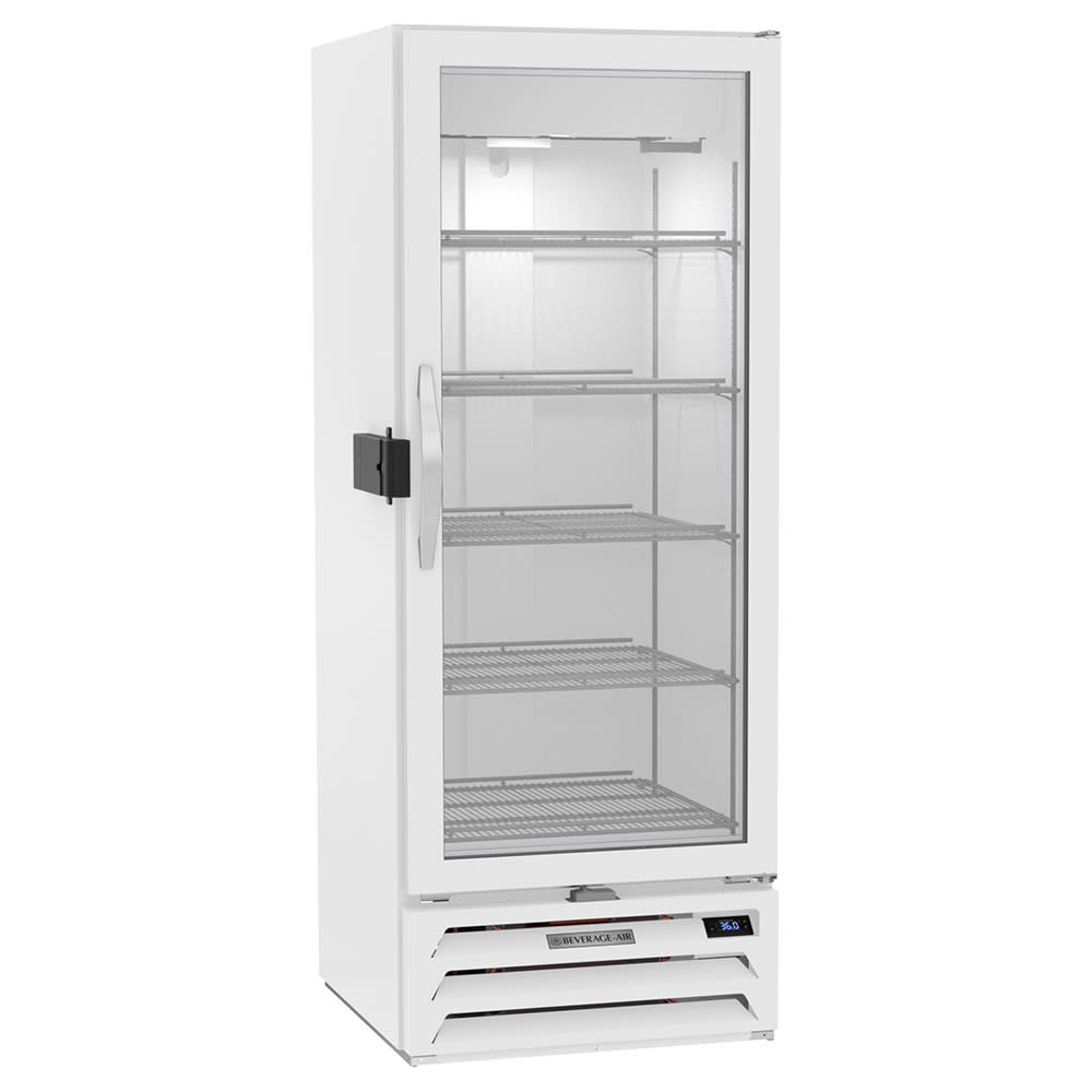 The Beverage Air MMR12HC-1-W-IQ refrigerated merchandiser’s white exterior and interior provide a clean, neat appearance that enhances the visibility of cabinet products to increase impulse buys. With its glass door, the unit shows employees how much product is left inside the cabinet so they know when merchandise needs to be reloaded. For product organization, the cabinet has four shelves.