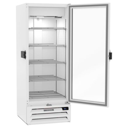 MarketMax Refrigerated Merchandiser, reach-in, one-section, (1) double pane hinged glass door with electronic lock, 12.06 cu. ft. capacity, electronic control, digital display, (4) epoxy coated wire shelves, LED interior lighting, self closing door with automatic hold-open feature, bottom-mounted refrigeration, white exterior, R290 Hydrocarbon refrigerant, 1/6 HP, cULus, UL EPH Classified, UL-Sanitation, Made in USA