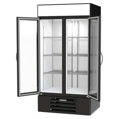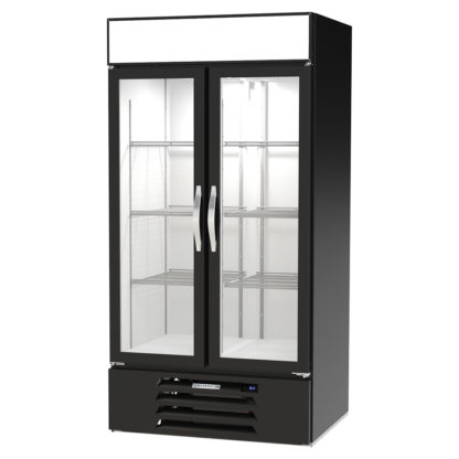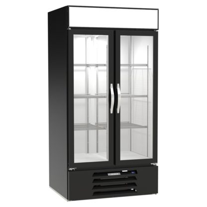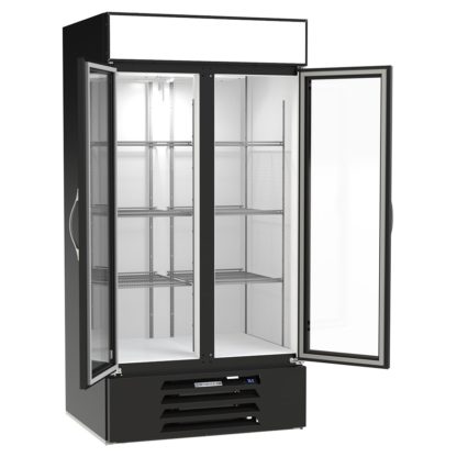 MarketMax Refrigerated Merchandiser, reach-in, two-section, 39-1/2″W, 78-1/8″H, (2) double pane hinged glass doors, 36.87 cu. ft. capacity, electronic control, digital display, (6) epoxy coated steel shelves, LED interior lighting, self closing door with automatic hold-open feature, bottom-mounted refrigeration, white interior, black exterior, R290 Hydrocarbon refrigerant, 1/4 HP, cULus, UL EPH Classified, UL-Sanitation, Made in USA