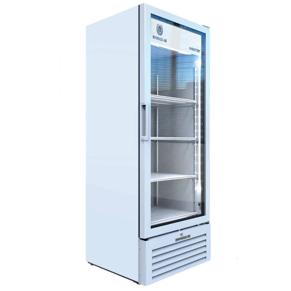 The Beverage Air MT12-1W Marketeer one-section glass door merchandiser has a white interior and exterior and uses LED lights to enhance product visibility. Through a dual-pane glass window, customers can clearly see displayed items. Epoxy-coated shelves hold product and provide corrosion resistance. The evaporator is also epoxy coated to add durability. The temperature is controlled electronically. The Beverage Air MT12-1W glass door merchandiser has 2-inch leveling feet that keep the unit stable.