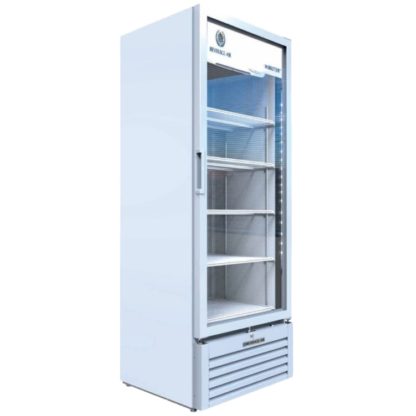 The Beverage Air MT23-1W Marketeer one-section glass door merchandiser has an electronic temperature control and cools with hydrocarbon refrigerant. Epoxy-coated shelves hold the displayed items, showing off product under LED interior lights. A glass door makes product visible and self-closes to retain cold air. The interior and exterior have white finishes that brighten the area. Leveling feet keep the Beverage Air MT23-1W glass door merchandiser stabilized on most uneven floors.