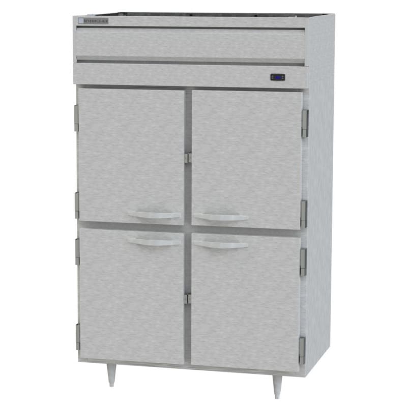 The Beverage Air PH2-1HS full-height heated cabinet has two sections with a combined 43.4 cubic feet of holding space. Each reach-in section has two half-doors, ensuring cabinet temperatures stay stable by limiting the warm air released when the doors are opened. These doors can be locked to protect product.