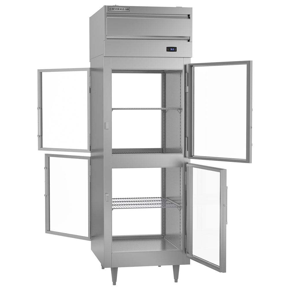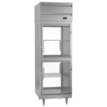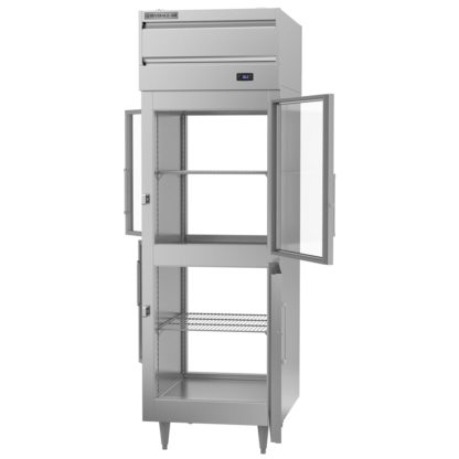P-Series Refrigerator, Pass-Thru, one-section, 22.9 cu. ft., top-mounted self-contained refrigeration, (4) glass half door, (3) adjustable shelves, LED lighting, aluminum interior, stainless steel exterior, standard depth, hinged glass half doors, exterior digital thermometer, 6″ legs, 1/3 HP, cULus, UL EPH Classified, UL-Sanitation, MADE IN USA