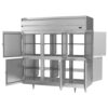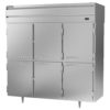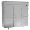 P-Series Refrigerator, Pass-Thru, three-section, 73.99 cu. ft., top-mounted self-contained refrigeration, (12) solid half doors, (9) adjustable shelves, LED lighting, aluminum interior, stainless steel exterior, standard depth cabinet, half-height doors, exterior digital thermometer, 6″ legs, 3/4 HP, cULus, UL EPH Classified, UL-Sanitation, MADE IN USA