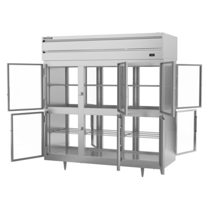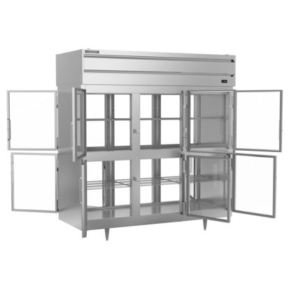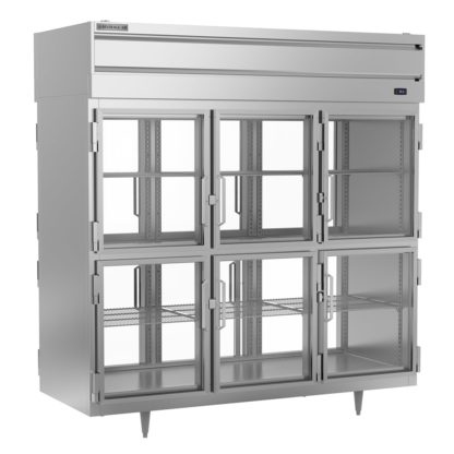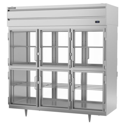 P-Series Refrigerator, Pass-Thru, three-section, 73.99 cu. ft., top-mounted self-contained refrigeration, (12) glass half doors, (9) adjustable shelves, LED lighting, aluminum interior, stainless steel exterior, standard depth, exterior digital thermometer, 6″ legs, (2) 1/3 HP, cULus, UL EPH Classified, UL-Sanitation, MADE IN USA
