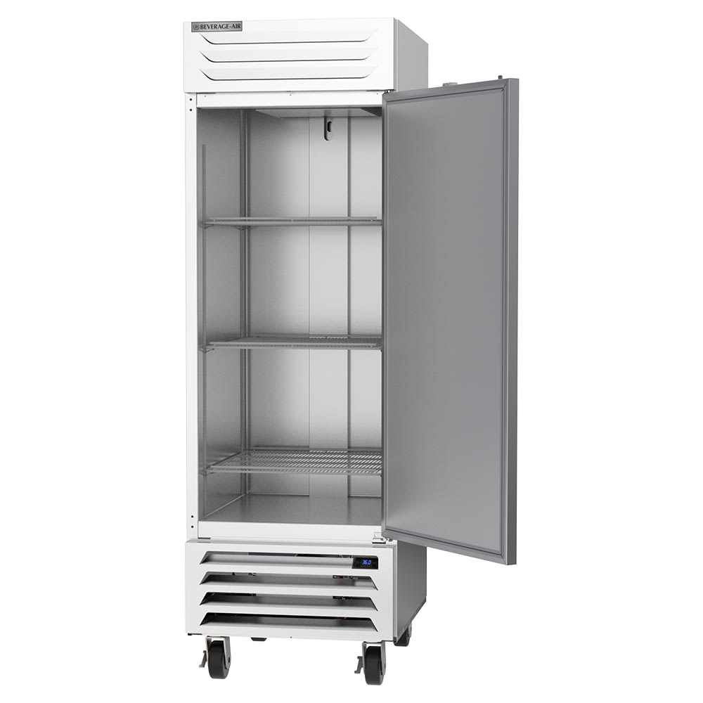 The Beverage Air RB23HC-1S single-section reach-in refrigerator has a stainless steel front and gray sides that match the rest of the unit. A self-closing design on the door helps keep cold air inside, while its 120-degree, stay-open feature keeps the door open for loading and unloading products. With LED interior lights, it is easy to see inside the cabinet. It has three epoxy-coated shelves that are heavy duty and corrosion resistant.