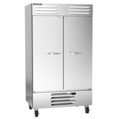 The Beverage Air RB44HC-1S two-section reach-in refrigerator has six epoxy-coated shelves that are adjustable to support different product sizes. Its cabinet is brightened by LED lighting and can be accessed with two solid doors. Locks on these doors keep product secure, and their self-closing design retains cold air.