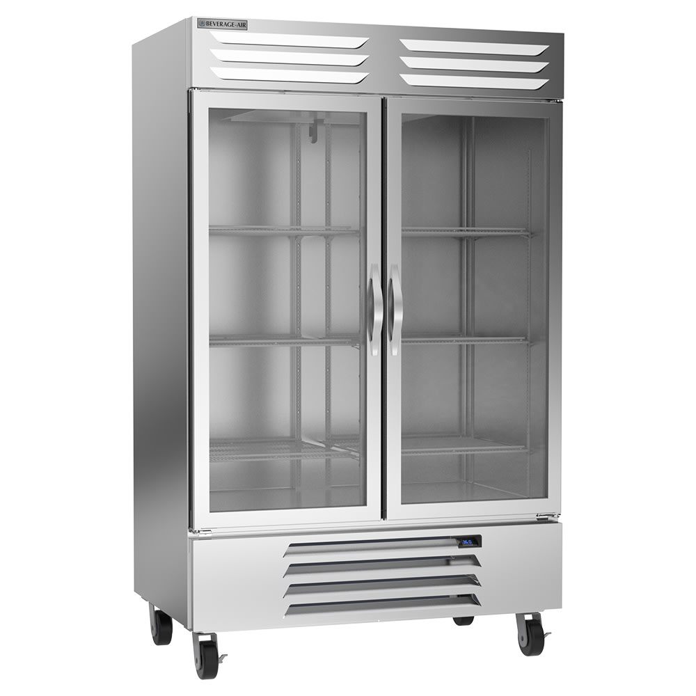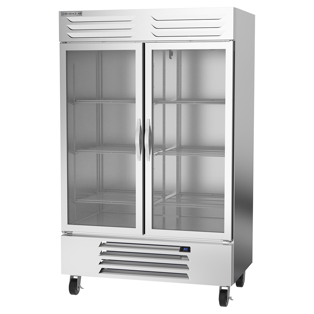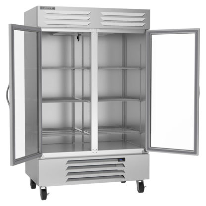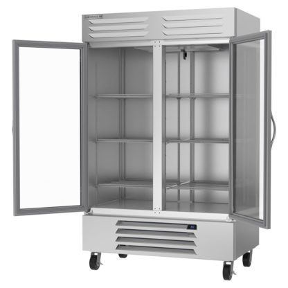 Because it has glass doors, the Beverage Air RB49HC-1G two-section reach-in refrigerator offers a view of the interior so users can find what they need without letting cold air out. These doors have a self-closing design but stay open at a 120-degree angle. Operators can lock the doors to keep product secure.