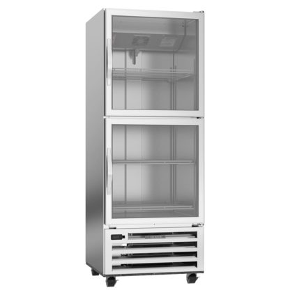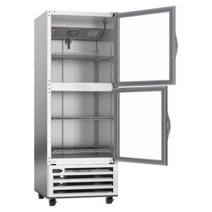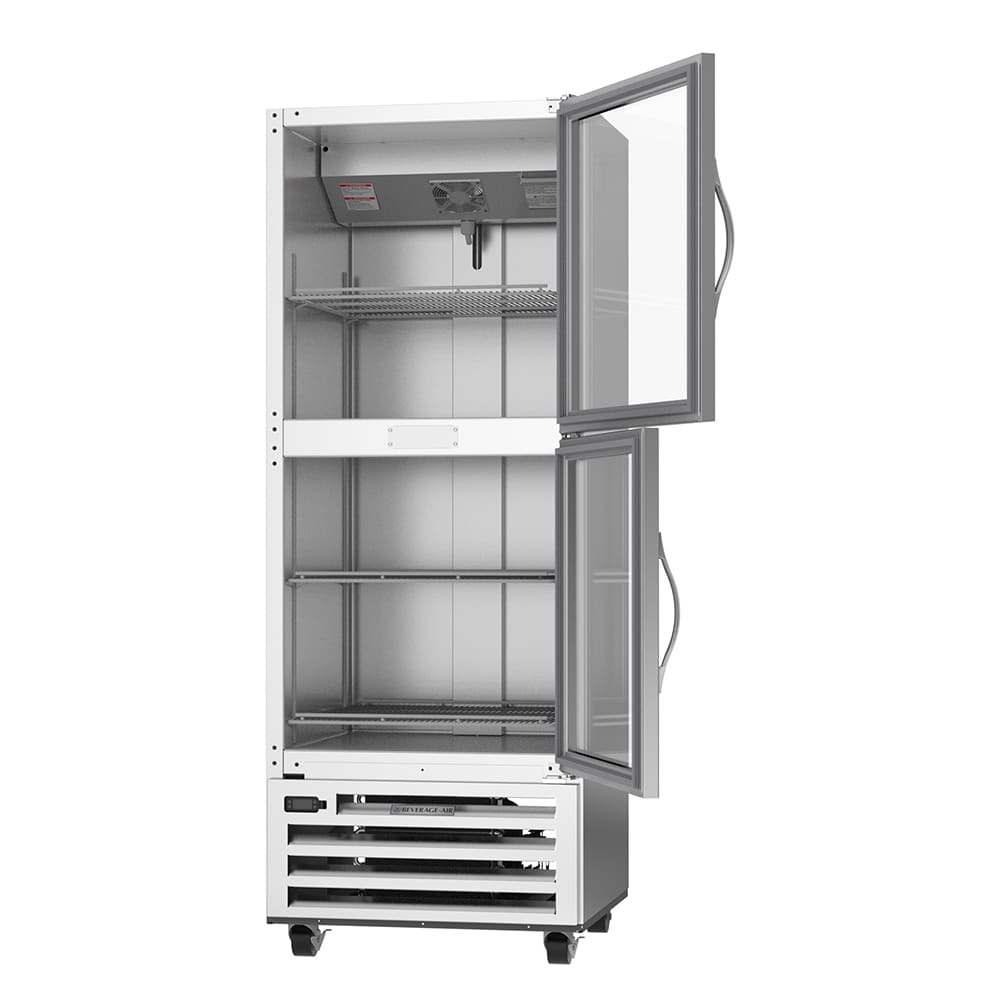 Reach-in Refrigerator, one-section, 16.85 cu. ft., (2) half glass hinged doors, (5) adjustable shelves,LED interior lighting, bottom-mounted self-contained refrigeration, stainless steel exterior & interior, 3″ casters, R290 Hydrocarbon refrigerant, 1/4 HP, cULus, UL EPH Classified, UL-Sanitation, Made in USA
