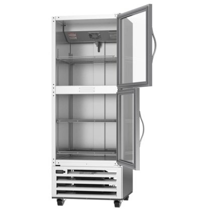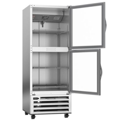 Refrigerator, Pass-Thru, one-section, 18.38 cu. ft., (4) half glass hinged doors, (4) adjustable shelves, LED interior lighting, bottom-mounted self-contained refrigeration, stainless steel exterior & interior, 3″ casters, R290 Hydrocarbon refrigerant, 1/4 HP, cULus, UL EPH Classified, UL-Sanitation, Made in USA