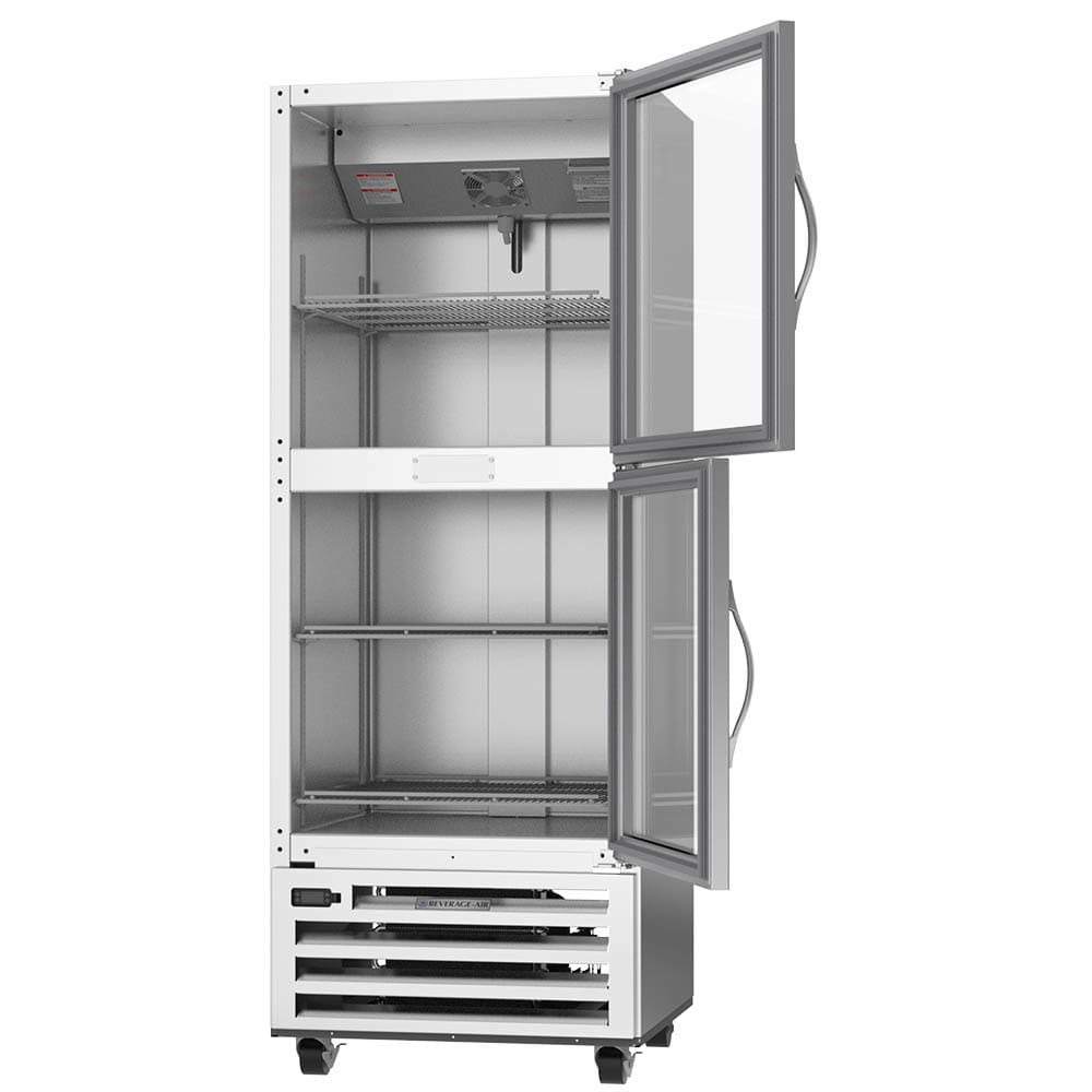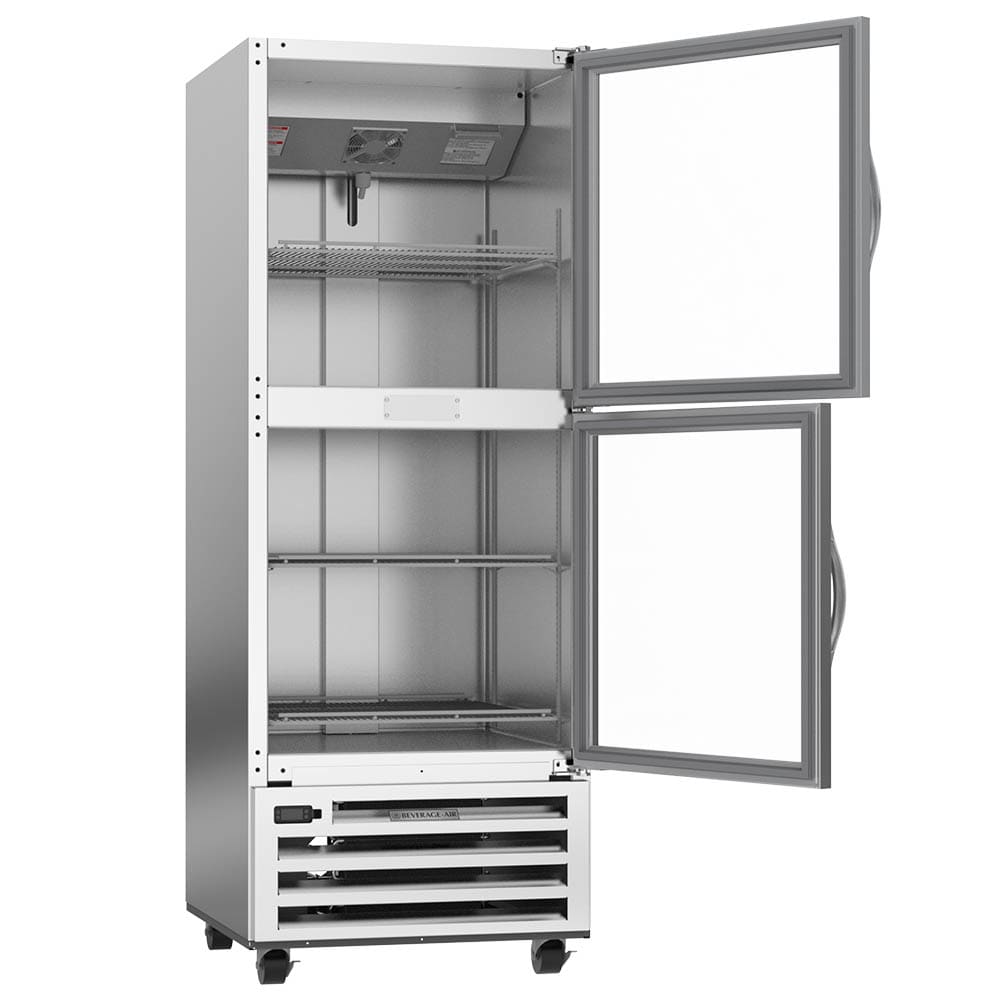 The Beverage Air RID18HC-HG one-section refrigerator has front and rear doors, creating a pass-thru design to connect the front and back of the house. These doors are half-height and made of glass, enabling users to see what they need before opening them. Self-closing to retain cold air, the doors have a stay-open design at 120 degrees for product loading and cabinet cleaning. The cabinet has four adjustable shelves and uses LED lighting to improve visibility.