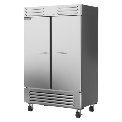 Because the doors of the Beverage Air SF2HC-1S two-section freezer can be locked, its contents are protected against theft and vandalism. Its stainless steel doors and grille are sturdy, resisting scratches and dents to maintain a professional appearance. Designed with a self-contained refrigeration system, this unit saves space when compared to a remote compressor. The compressor is mounted on the bottom, raising the floor of the unit to reducing stooping when lifting heavy items in and out of the freezer.