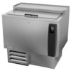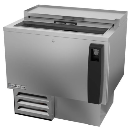 Bottle Cooler, flat top, 34″W, 6.7 cu. ft., 28″D, (1) sliding lid, (2) adjustable wire dividers, shallow well design, bottle cap & cap catcher, galvanized interior, stainless steel exterior, stainless steel top, bottom mounted self-contained refrigeration system, R290 Hydrocarbon refrigerant, 1/10 HP, cULus, UL EPH Classified, EL-Sanitation, MADE in USA