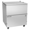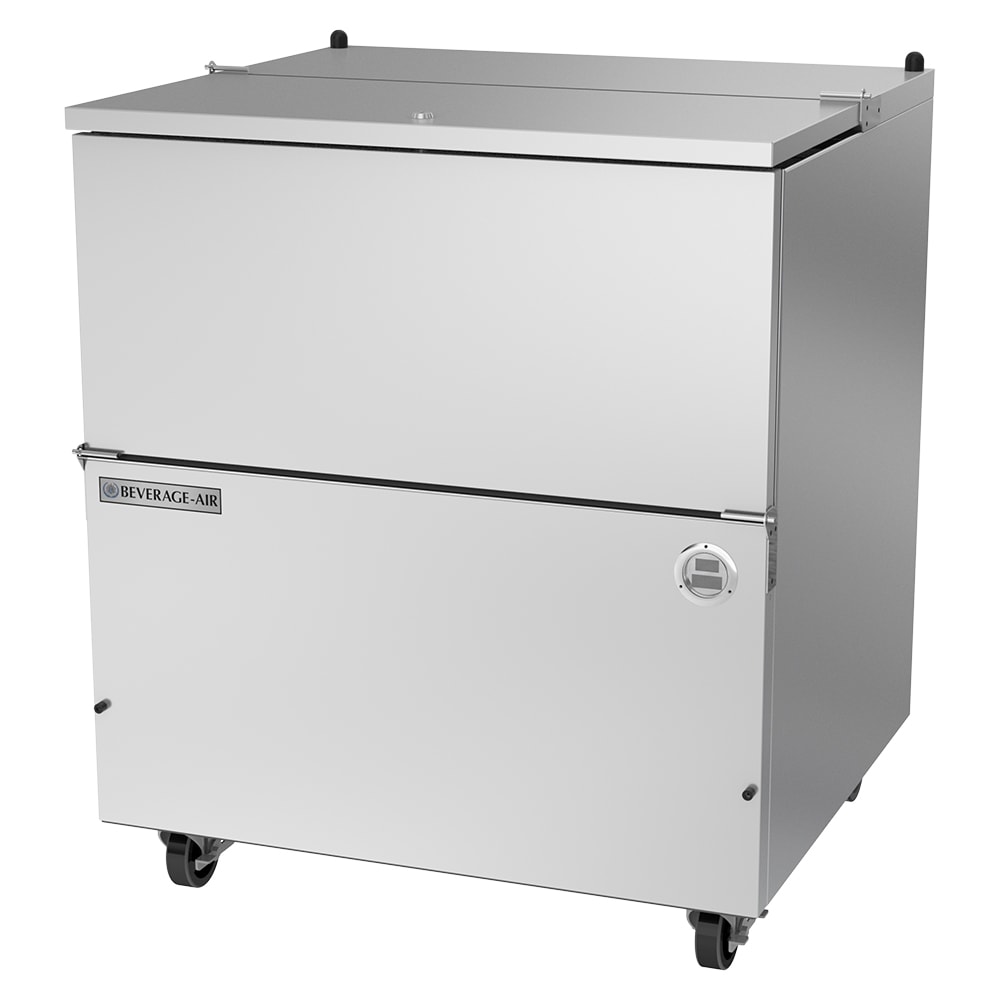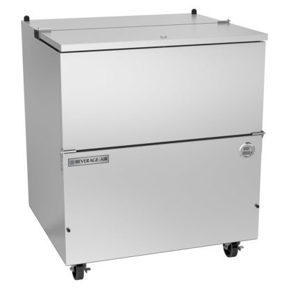 Ideal for school cafeterias, the Beverage Air SM34HC-S milk cooler has electronic controls to keep milk between 36 and 38 degrees Fahrenheit. An exterior thermometer enables monitoring, so users can make sure that milk doesn’t spoil and make consumers sick. It cools with a cold-wall evaporator in the cabinet, and its coil is epoxy coated to help prevent it from corroding. Automatic defrost eliminates any ice that forms in the unit, and a floor drain removes water when the ice melts. Mounted on 4-inch casters, this unit is can be moved throughout the cafeteria.