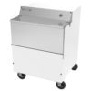 School Milk Cooler, forced air, 34″W x 33-5/8″D x 46-7/8″H, 13.59 cu. ft., single access, exterior digital thermometer, (8) 13″ x 13″ x 11″ or (4) 19″ x 13″ x 11″ case capacity, self-latching doors/lids with safety bumpers, cylinder lock, wire floor racks, floor drain, electronic control, auto defrost, galvanized steel interior with stainless steel floor, white exterior, R290 Hydrocarbon refrigerant, 1/6 HP, cULus, UL EPH Classified, UL-Sanitation, Made in USA