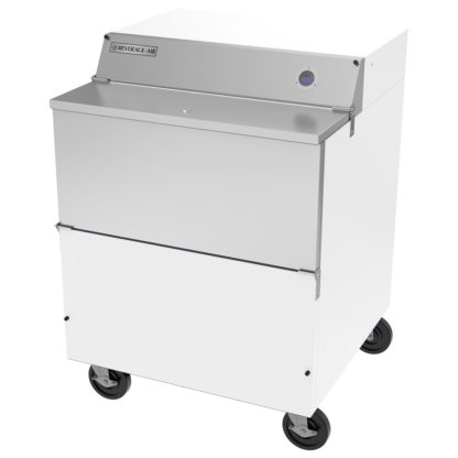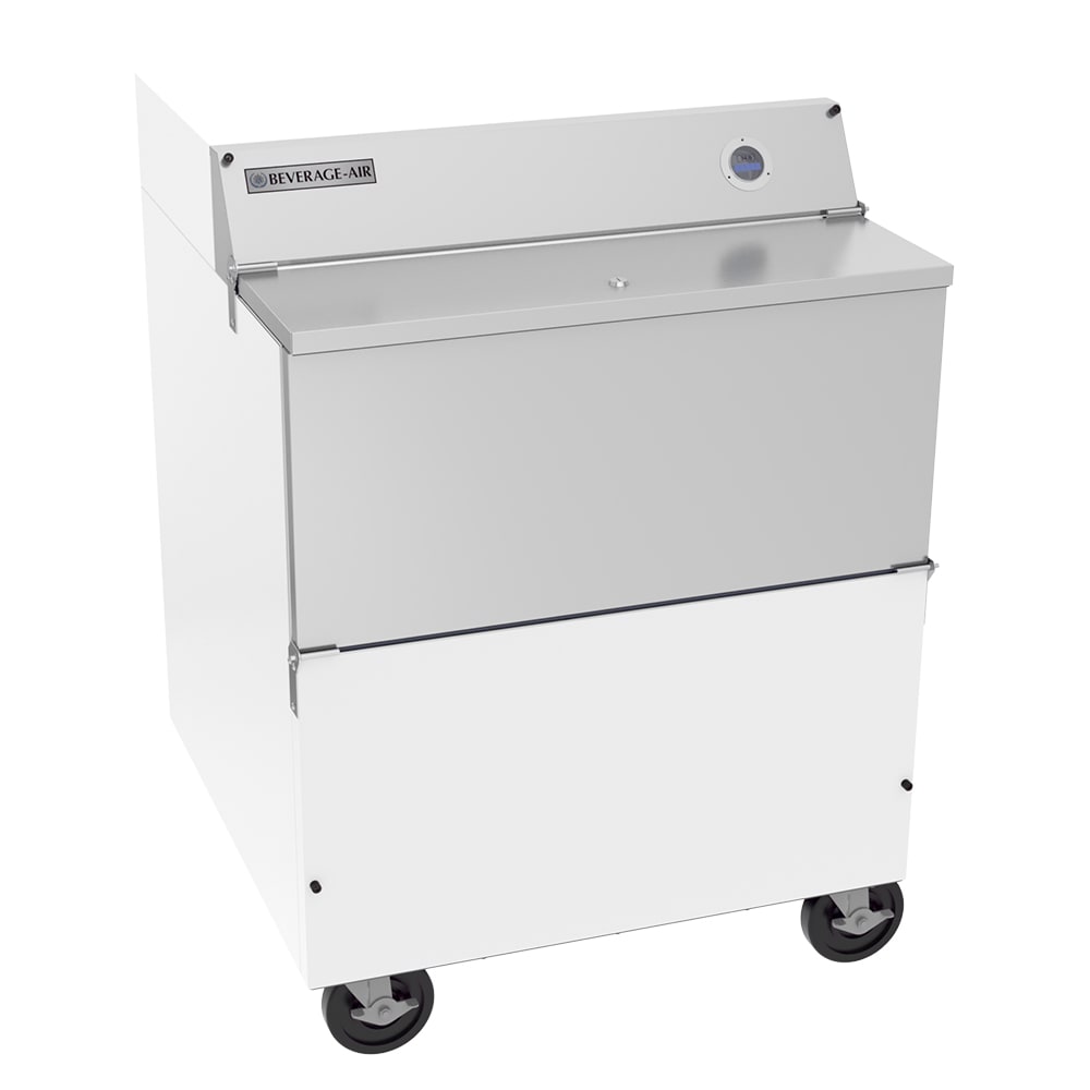 To keep milk cold, the Beverage Air SMF34HC-1-W cooler uses R290 hydrocarbon refrigerant, and operators can monitor this temperature with the external digital thermostat. This piece of equipment is great for cafeterias and schools. It measures 34 inches in width by 33.5 inches in depth by 47.13 inches in height and cools using forced air. To keep product cold, the doors self-latch; the lids are built with bumpers for enhanced safety.