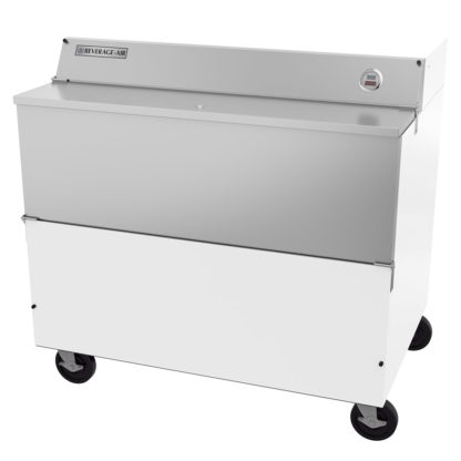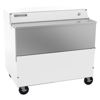 The Beverage Air SMF49HS-1-W-02 milk cooler has front and side doors so customers can serve themselves. Side doors enable children to access milk, and staff members can lock the cooler to prevent theft when serving time is over. With its heavy duty casters, the unit is mobile and stays stable.