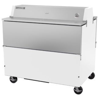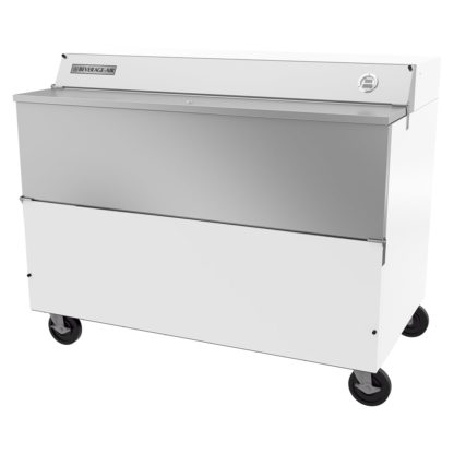 The Beverage Air SMF58HC-1-W-02 milk cooler can be moved from the kitchen to a serving area with casters, and the casters have locks to stay in place. A white finish over stainless steel maintains a clean appearance, while customers are able to pull back a door to reach the contents through the side or top. Bumpers protect the exterior from dents, scratches, and scuffs, and the lids lock to secure contents.