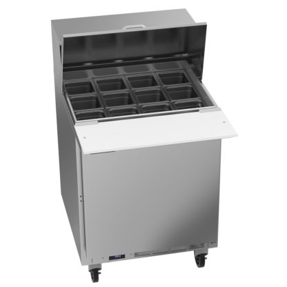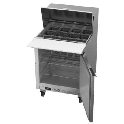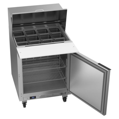 Elite Series Mega Top Refrigerated Counter, one-section, 27″W, 4.8 cu. ft., (1) door, stainless steel top with opening for (9) 1/6 & (3) 1/9 size pans, removable 10″ cutting board, (2) epoxy-coated wire shelves, stainless steel exterior, aluminum interior, rear-mounted self-contained refrigeration, (pans furnished are 4″ deep, tops will accommodate 6″ deep pans), 6″ casters (2 with brakes), R290 Hydrocarbon refrigerant, 1/6 HP, UL, cULus, UL EPH Classified, UL-Sanitation, MADE IN USA, 115v/60/1ph