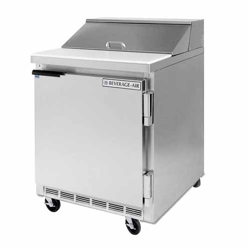 The Beverage Air SPE27HC-12M-B-DS Elite Series prep table holds 12 sixth-size, 4-inch-deep pans in the middle. Toppings for salad, sandwiches, and pizza sit in the pans. To easily prep ingredients, there is a 10-inch cutting board on one side of the unit and a 12-inch cutting board on the other side. With a stainless steel exterior and top, this cabinet is easy to clean and resistant to minor damage. Extra blocks of cheese, lettuce, dough, and other products can be stored in the cabinet. The Beverage Air SPE27HC-12M-B-DS Elite Series prep table has a self-contained refrigeration system that uses R290 hydrocarbon refrigerant to keep temperatures cool.