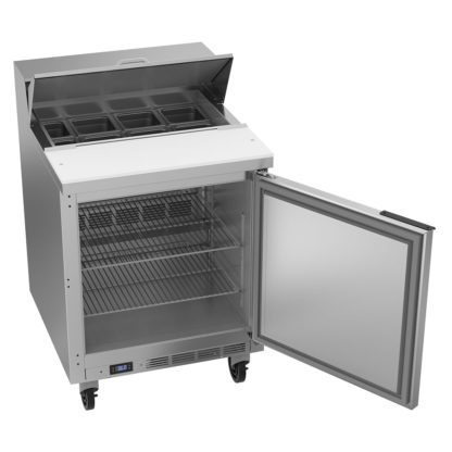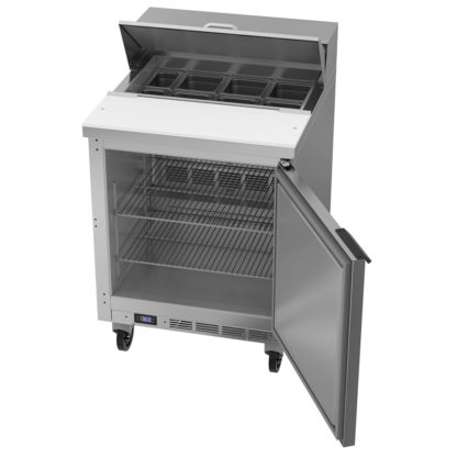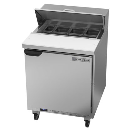 The cabinet has a storage space for extra ingredients that is kept between 36 and 38 degrees Fahrenheit by R290 hydrocarbon refrigerant. Staff can stock the cabinet through the 120-degree stay-open door. Its self-closing design keeps air inside the Beverage Air SPE27HC salad prep table.