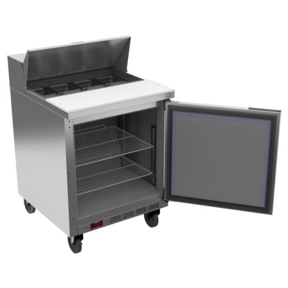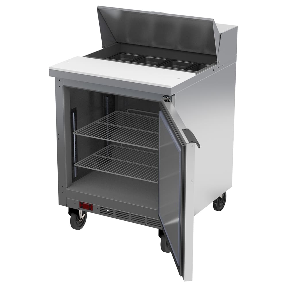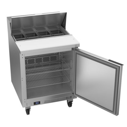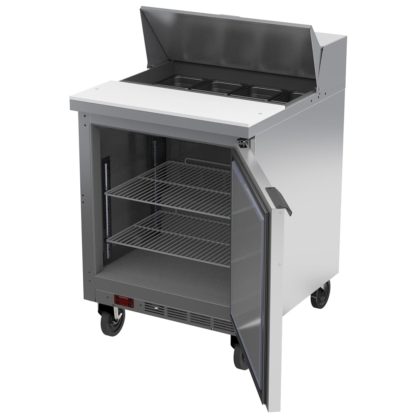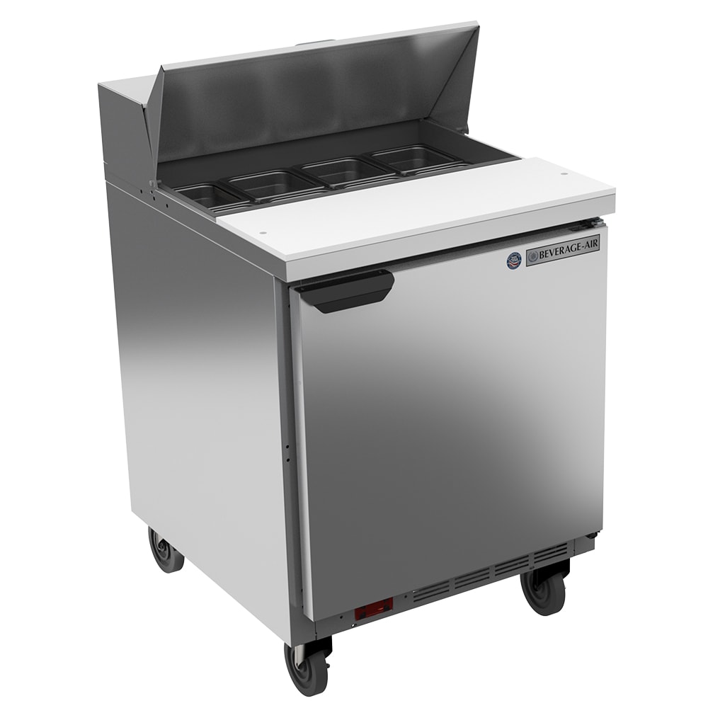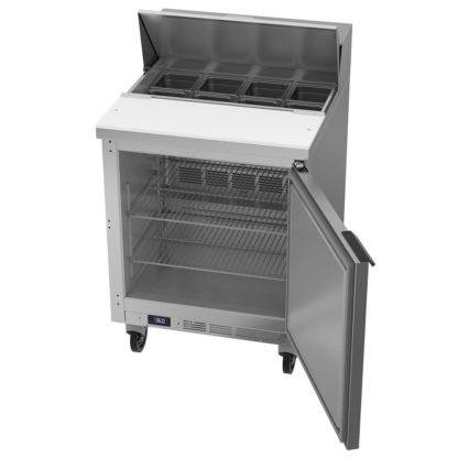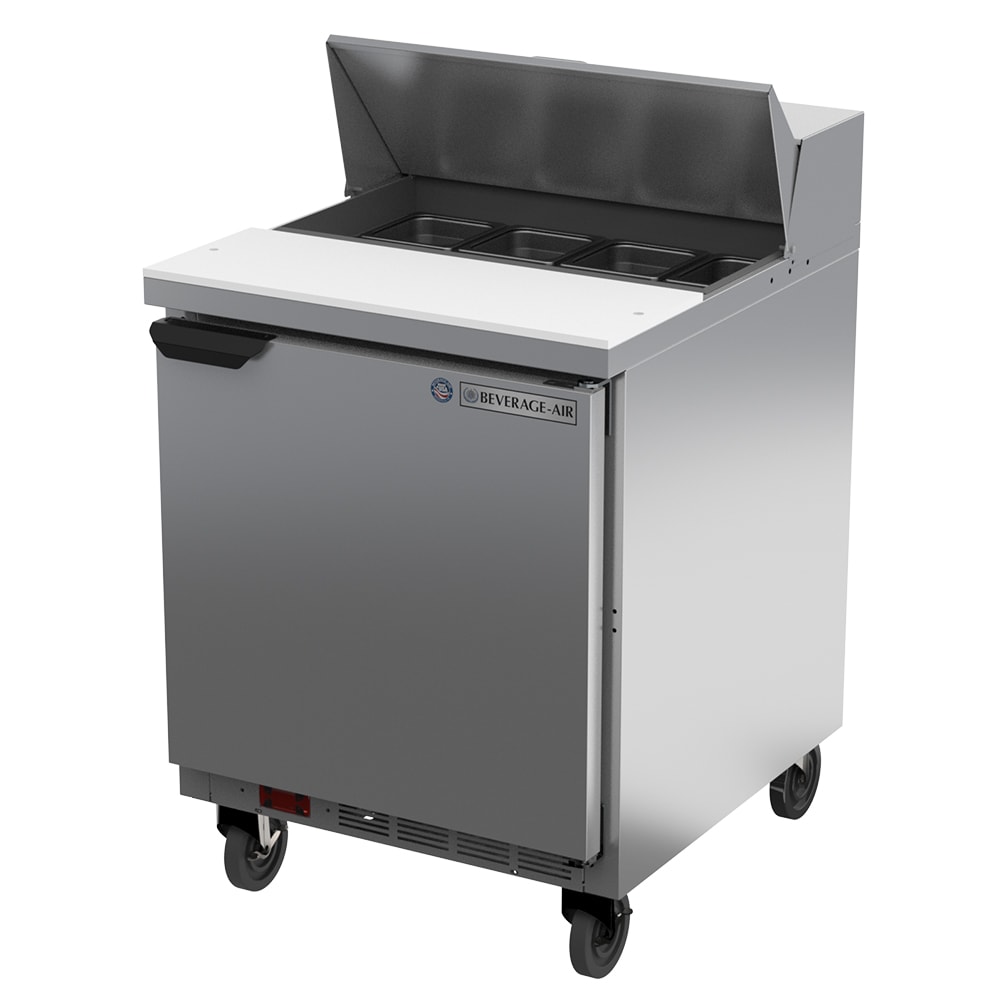 The Beverage Air SPE27HC-B Elite Series prep table is constructed of durable stainless and galvanized steel. Its aluminum interior is also heavy duty for constant use. This unit is ideal for prepping pizzas, sandwiches, and salads with the eight sixth-size, 4-inch-deep polycarbonate pans in the open compartment that hold toppings. A 10-inch-deep cutting board makes it easy to prep ingredients on the table.