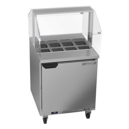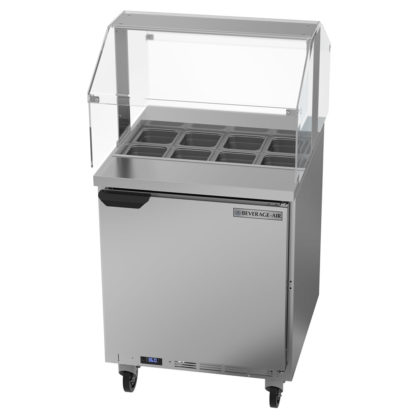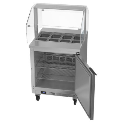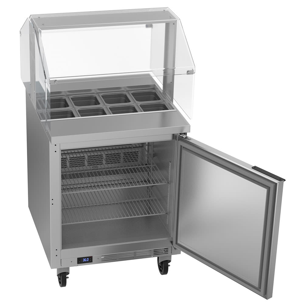 Elite Series Sandwich Top Refrigerated Counter with Sneezeguard, one-section, 27″ W, 4.8 cu. ft., (1) door, stainless steel top with opening for (8) 1/6 size pans, 10″ cutting board, stainless steel exterior, aluminum interior, rear-mounted self-contained refrigeration, (pans furnished are 4″ deep, tops will accommodate 6″ deep pans), R290 Hydrocarbon refrigerant, 1/6 HP, UL, cUL, UL EPH, MADE IN USA, 115v/60/1ph