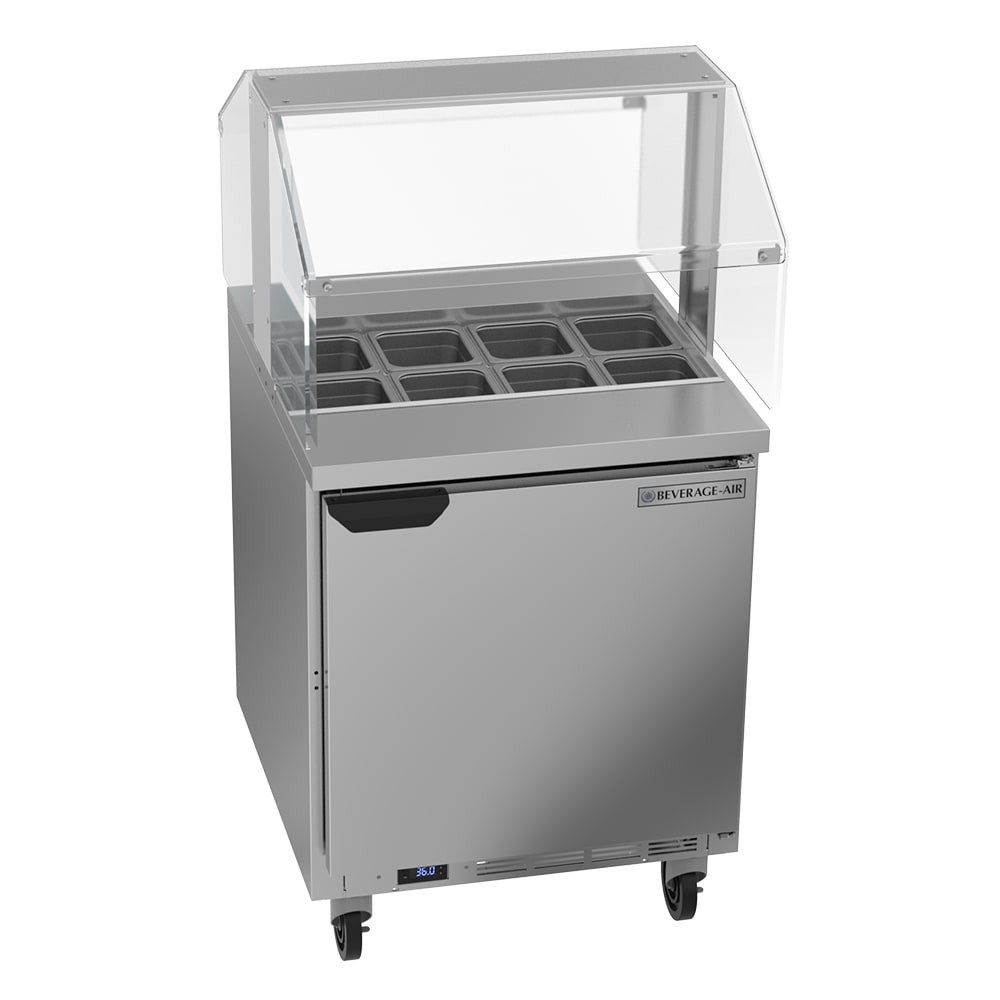 Product is held in the pan compartment of the Beverage Air SPE27HC-SNZ Elite Series prep table in six sixth-size, 4-inch-deep pans and two ninth-size, 4-inch-deep pans. These pans are recessed 2 inches into the cabinet, so forced air from the evaporator can properly flow under them to keep the ingredients above freezing and below 41 degrees Fahrenheit. Running the full length of the cabinet, the removable cutting board creates a convenient place for prepping salads and sandwiches. A sneeze guard covers the pans and cutting board to keep the prep area safe from contamination.