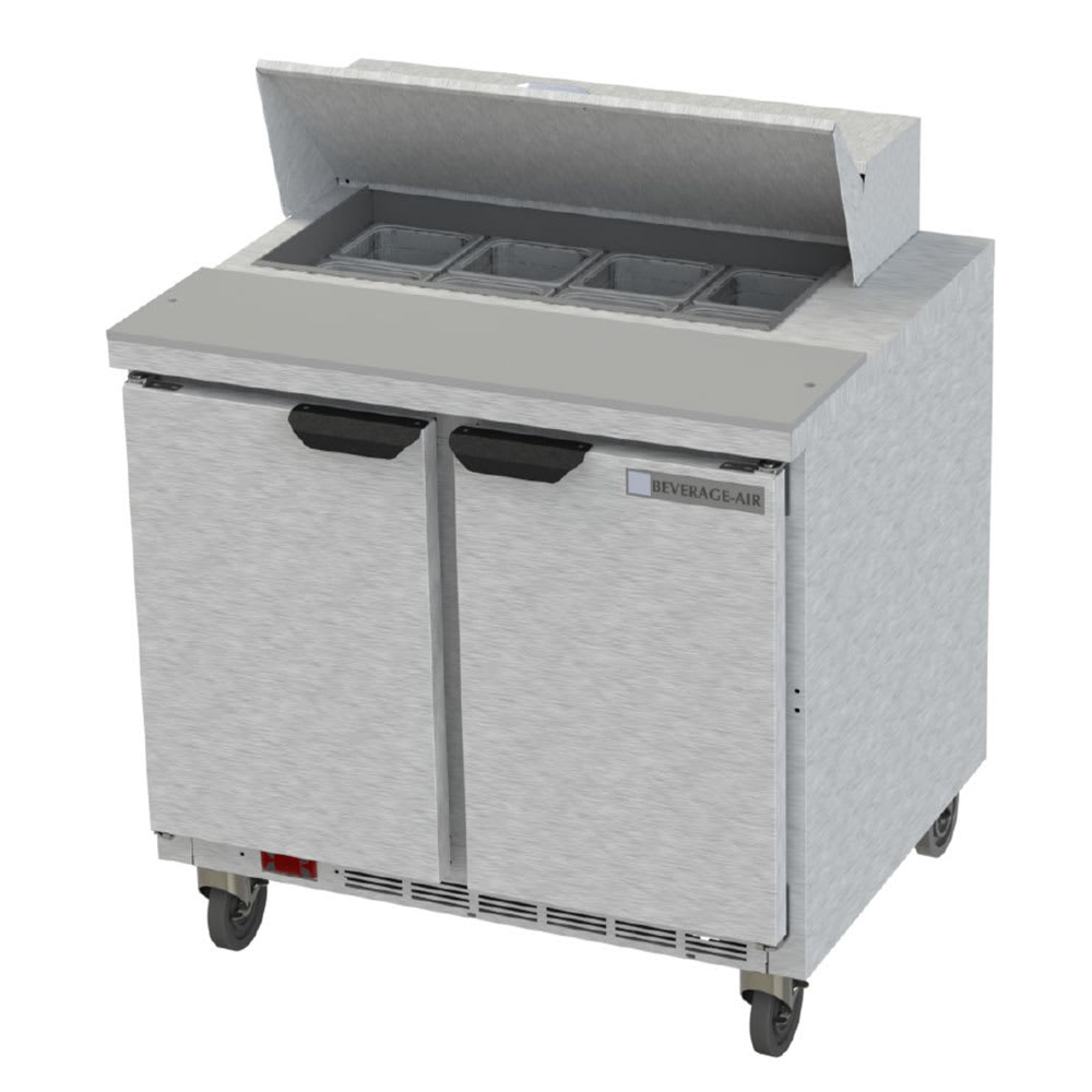 The Beverage Air SPE36HC-08 Elite Series prep table has self-closing doors that can stay open 120 degrees and be removed for cleaning. Doors are field reversible to suit different layouts, and the snap-in gaskets seal in cold air. Four 6-inch casters enable transportation, and the table has a 10-inch-wide removable cutting board made of white polyethylene plastic. Four epox- coated steel wire shelves hold product inside, while the Beverage Air SPE36HC-08 prep table includes eight sixth-size, 4-inch-deep pans. Pans are recessed two inches from the top of the cabinet, and the cabinet exterior is mostly constructed of stainless steel with a corrosion-resistant aluminum interior liner.