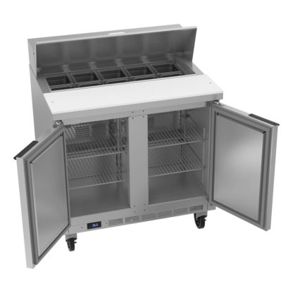 Elite Series Sandwich Top Refrigerated Counter, two-section, 36″W, 7.3 cu. ft., (2) doors, (4) shelves, stainless steel top with opening for (10) 1/6 size pans, 10″ cutting board, stainless steel exterior, aluminum interior, rear-mounted self-contained refrigeration, (pans furnished are 4″ deep, tops will accommodate 6″ deep pans) R290 Hydrocarbon refrigerant, 1/6 HP, UL, cULus, UL EPH Classified, UL-Sanitation, MADE IN USA, 115v/60/1ph